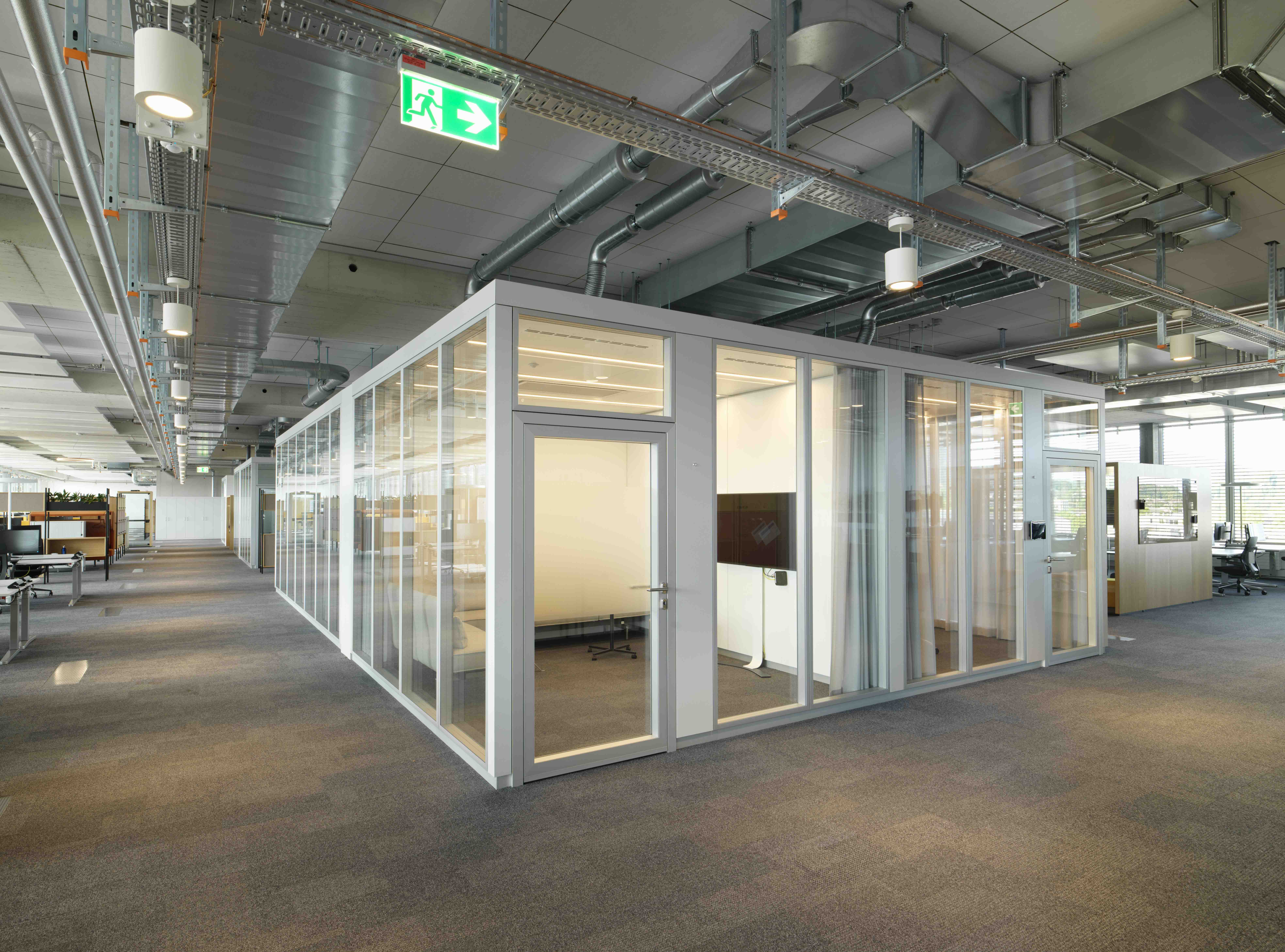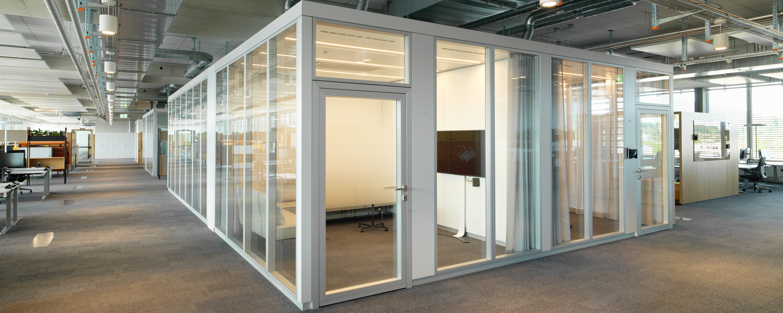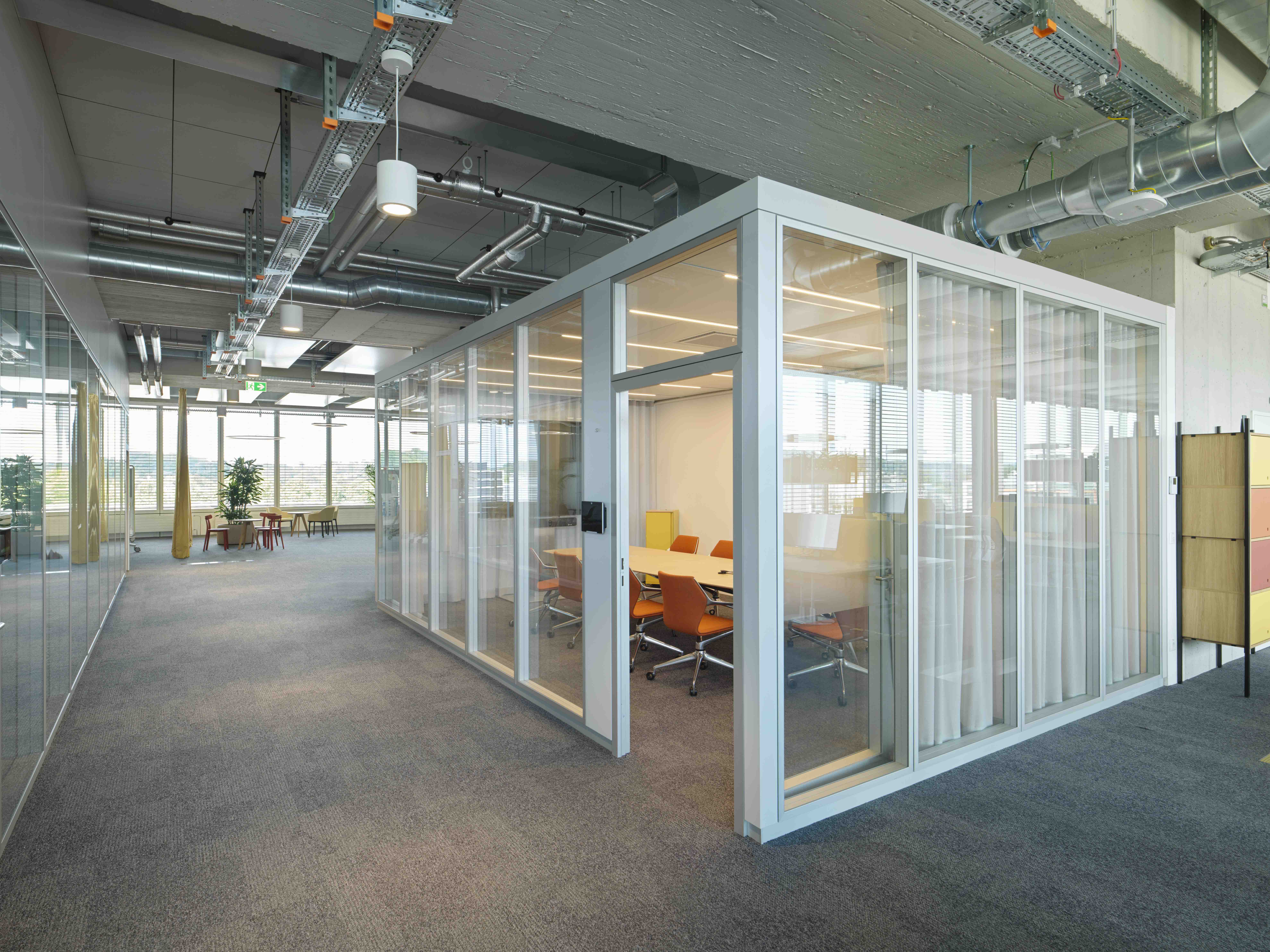 The result is a work environment that equally meets modern demands for communication, concentration, and comfort—executed with technical precision and architectural sophistication. Thanks to the modular design of both the partition wall and room-in-room systems, flexible use remains possible in the future.