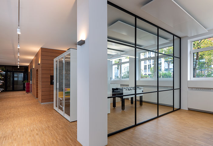 Ganzglas Bauweise mit vertikalen und horizontalen Unterteilungen