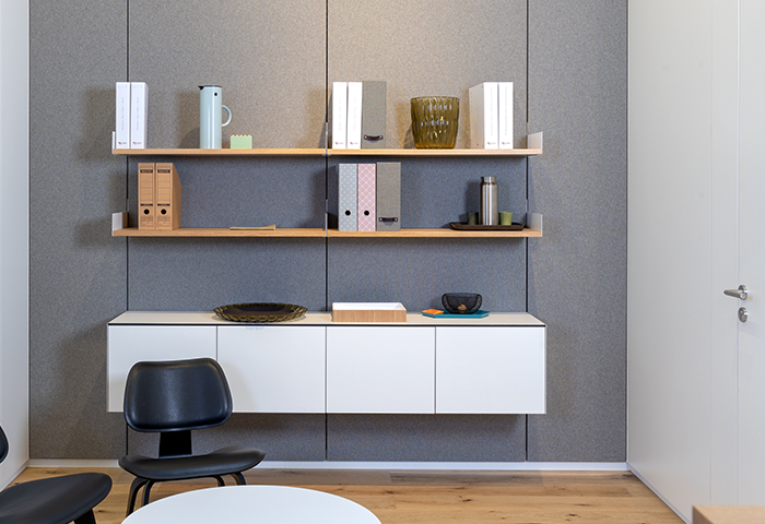 Strähle develops its products with a holistic view of the requirements and needs of the users. The system joint of the partition walls is used for hanging furniture and accessories. These can be attached tool-free in just a few movements. Shelves and sideboards in a number of different open and closed versions, flipcharts, coat racks, door plates, magnetic rails and other extras enable individual design of the workplaces.