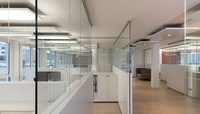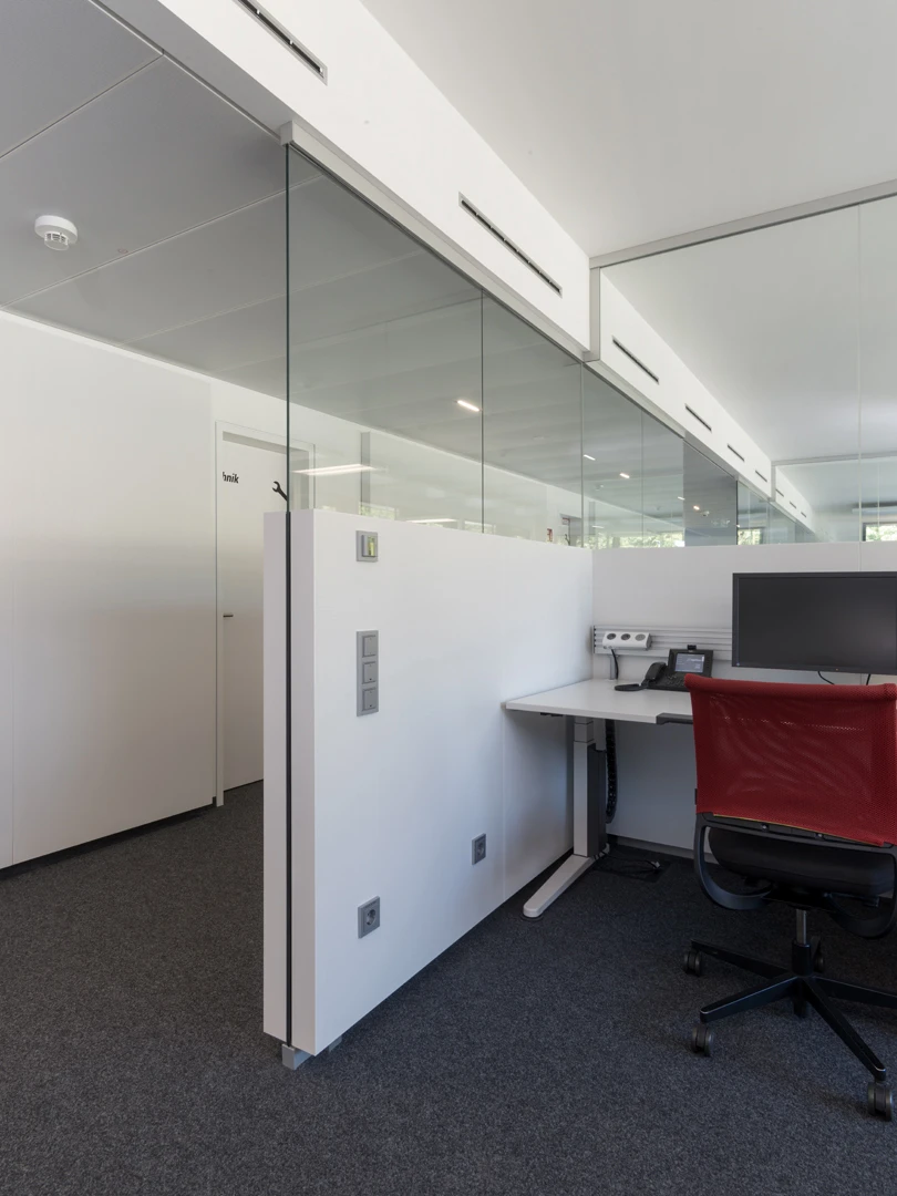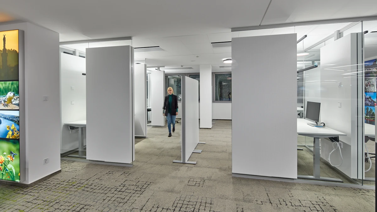 The transparent System 7400 combines ceiling-high glazed elements with wall-mounted and ceiling-mounted absorbers. This means that it is possible to create acoustically separate zones. The discreet arrangement of the highly-effective absorbers helps retain the openness of open spaces.