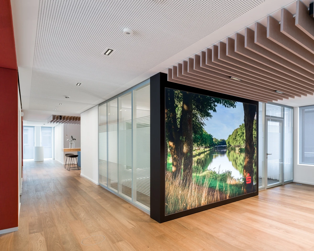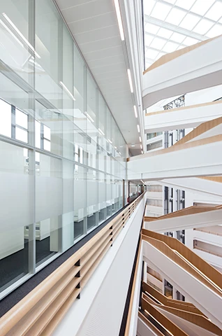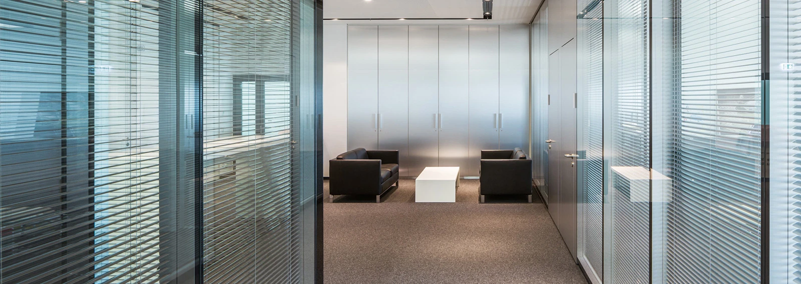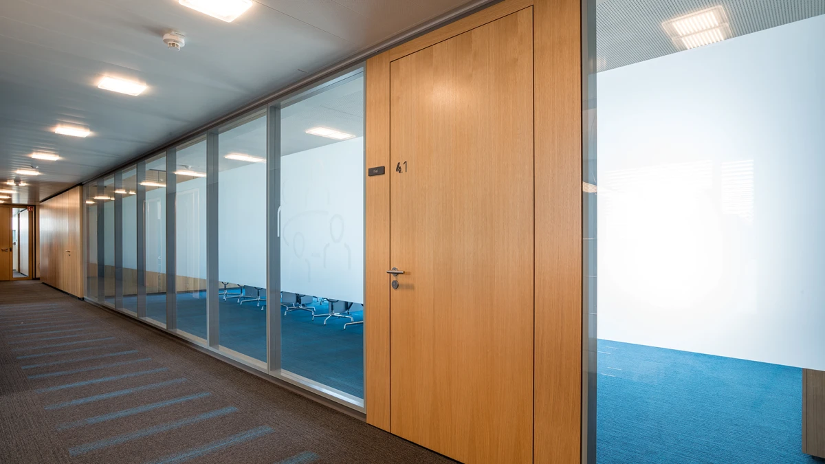 The 2300 partition wall system is the structural glazing variant of the 2000 system family. It is characterised by its reflective glass appearance and impresses with its high sound insulation values. The glazing is manufactured as all-glass elements and suspended on both sides in the substructure.