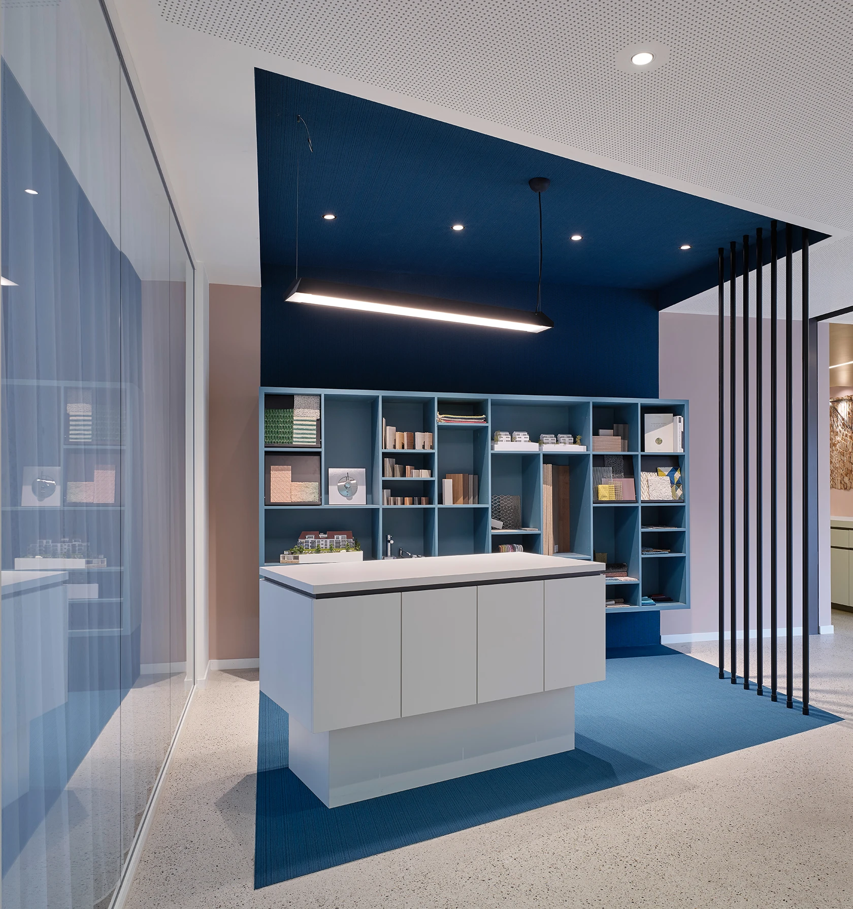 Esslingen am Neckar: the new offices of the family-run company, Metzger, are situated amongst half-timbered houses and idyllic narrow canals. The Ippolito Fleitz Group created a modern "home-from-home" office on two floors for more than 40 employees. The objective was to create the impression of partner-like togetherness for both customers and staff of the property developer and real estate agent as well as a working atmosphere which reflects the company's philosophy.