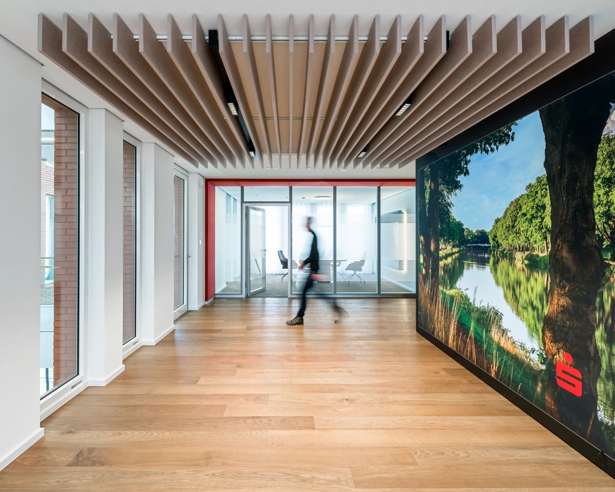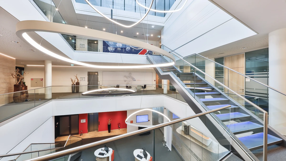 Modern office environments in these changing times are communicative, inspiring and pleasant to be in. The office premises of NAUE GmbH, designed by ATELIER BOUCHERIE & VOLLMERT, have precisely these qualities. Warm materials such as wood and textiles combined with contrasting profiles and indirect lighting provide a pleasant ambience. Curved glass panes provide flowing transitions between the offices and the open areas intended for exchanging ideas amongst staff.