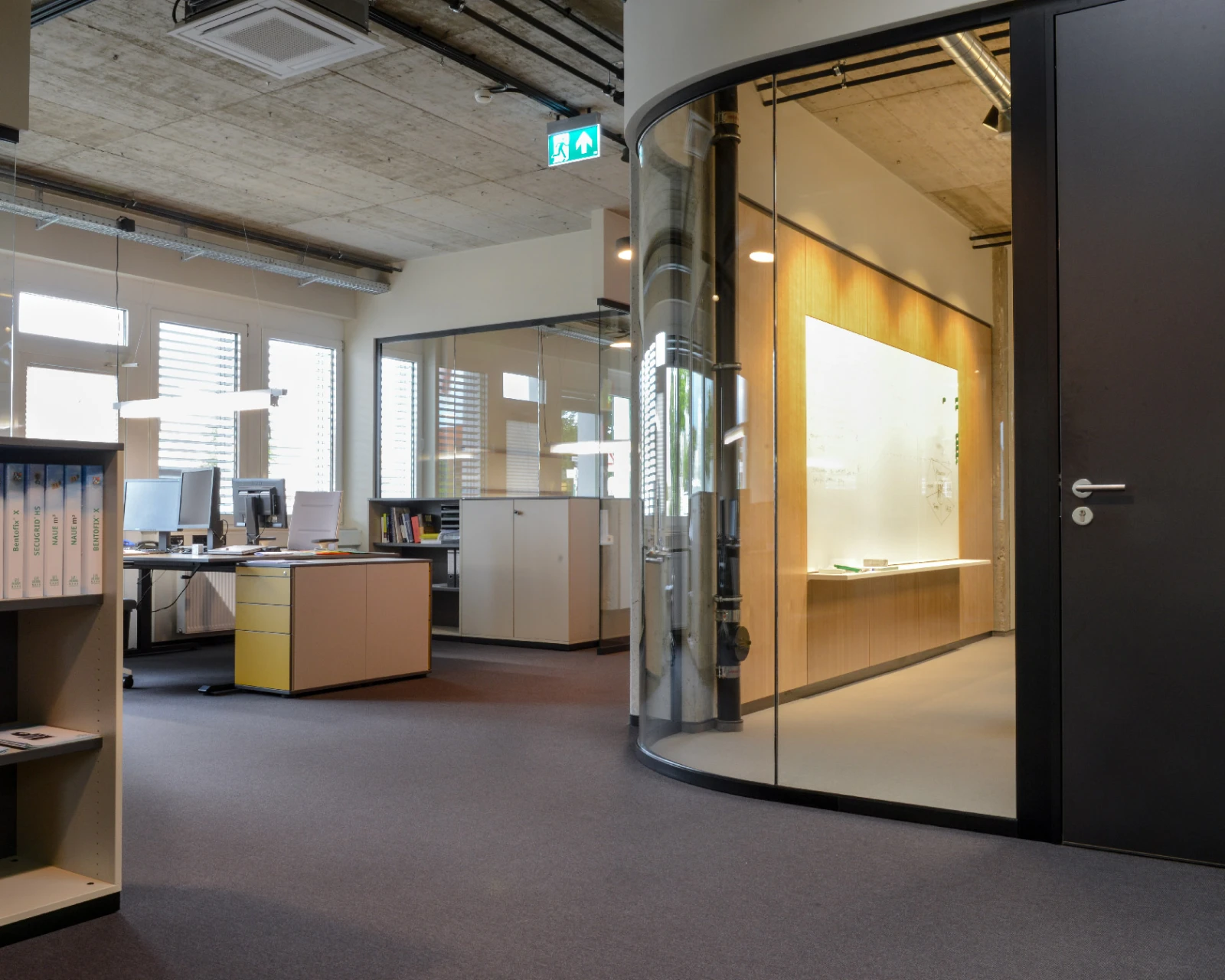 In the conference room, presentation surfaces are integrated into the partition wall. On the corridor side there is System Orga shelving from Strähle, hung directly into the structure and providing space for the library. Whiteboards are integrated into the partition wall, enabling flexible use for presentations. The advantages of modular system partition walls as design and function supports truly come into their own for this project.