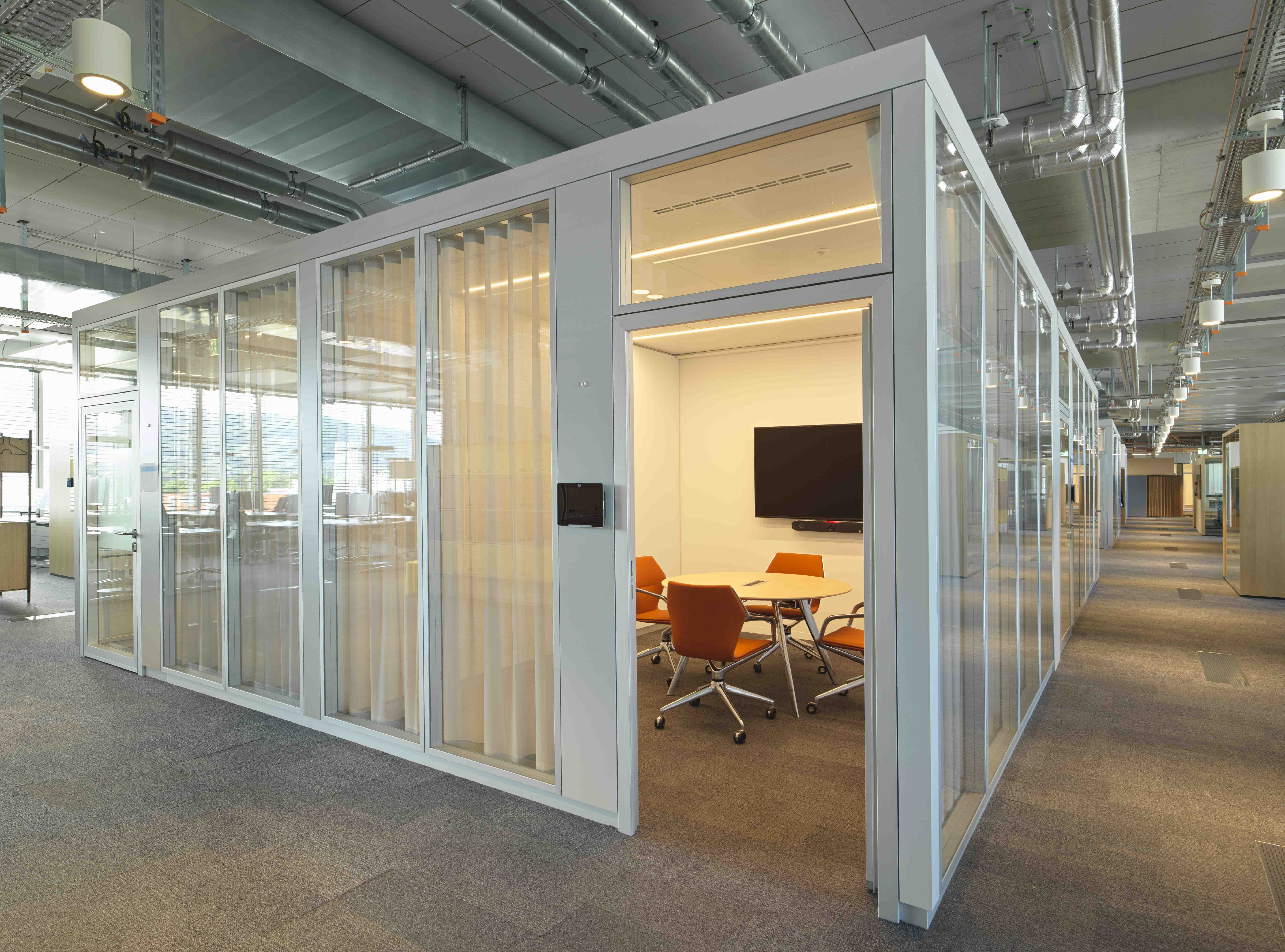 The result is a work environment that equally meets modern demands for communication, concentration, and comfort—executed with technical precision and architectural sophistication. Thanks to the modular design of both the partition wall and room-in-room systems, flexible use remains possible in the future.