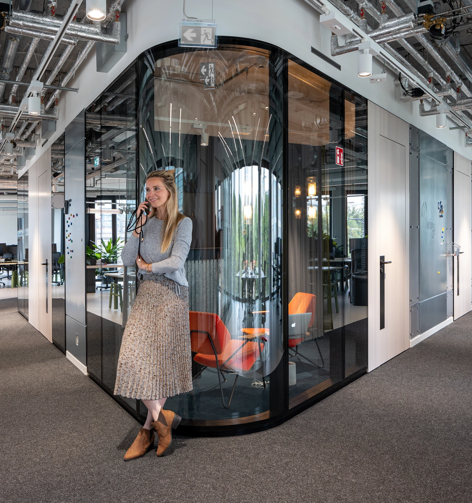 The 2300 partition wall system from Strähle has been installed throughout and the flush structural glazing system with its black profiles creates an upmarket look for the office areas. Curved glazing creates flowing transitions and is teamed with independently lit spaces to create a unique atmosphere. Doors covered in light veneer are flush fitted on the corridor side, ensuring maximum sound insulation for quiet, focused work, and contrast beautifully with the black profiles of the glass walls. Blinds add the perfect finishing touch to the system, balancing transparency and discretion in a way that is both practical and elegant.