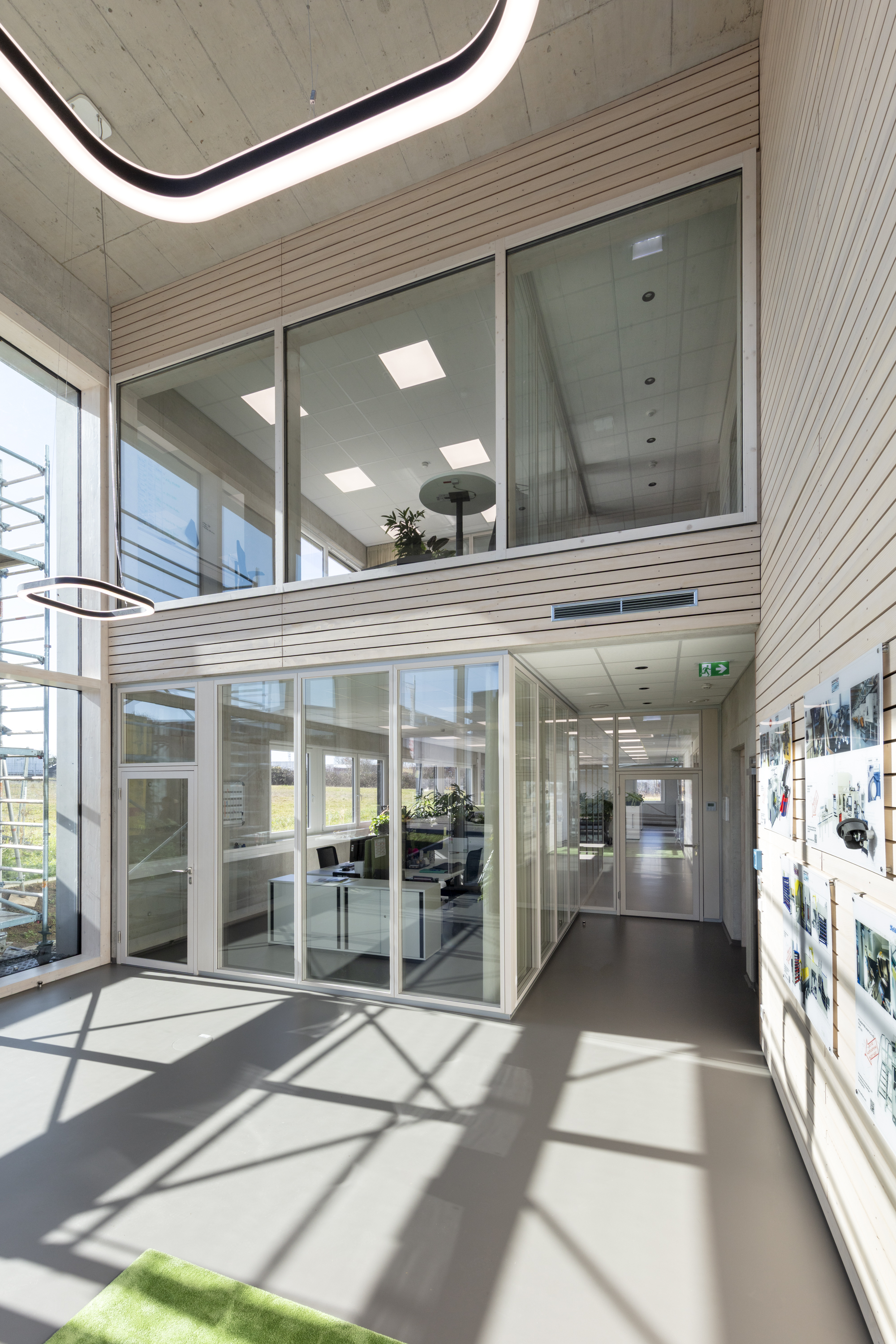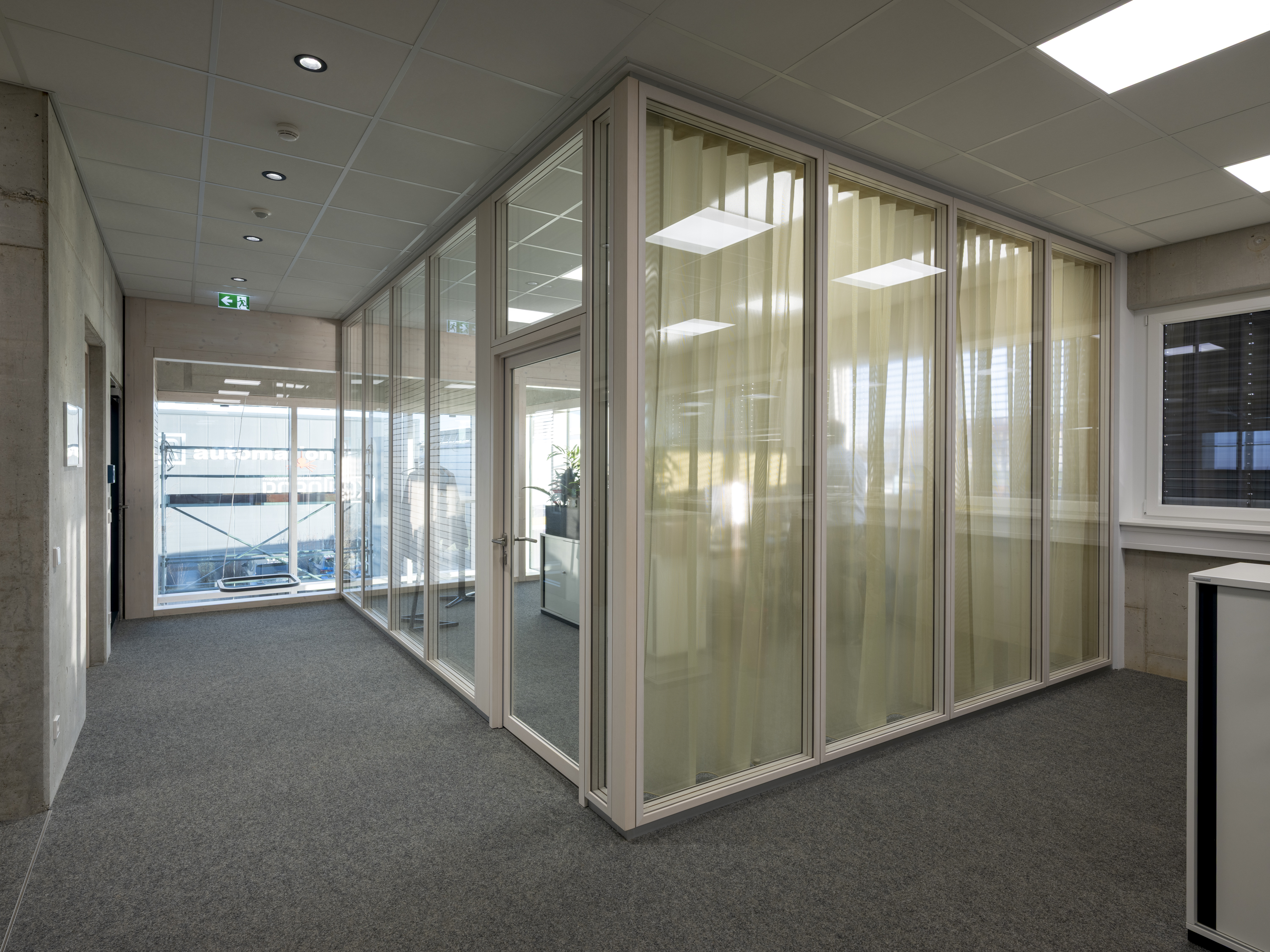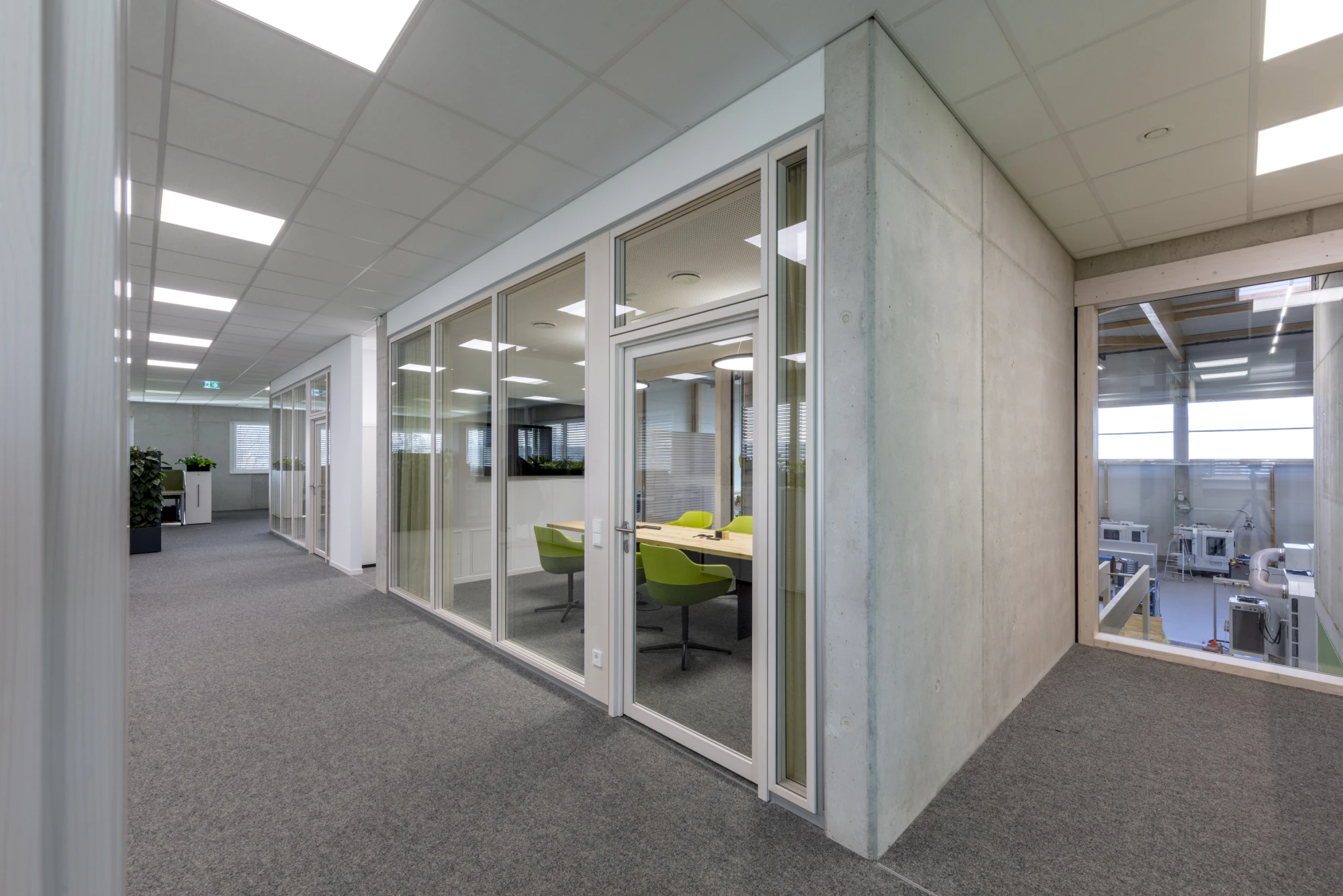 The project placed particular emphasis on sustainability. The new building meets modern energy standards and creates the ideal conditions for future-oriented work processes. The 2000_Nature partition wall system makes a significant contribution to the system walls’ CO2-reduced and long-term design. The system’s glazing frames and door frames consist of a veneered solid wood profile. In this project, these were finished with a white-pigmented spruce veneer.