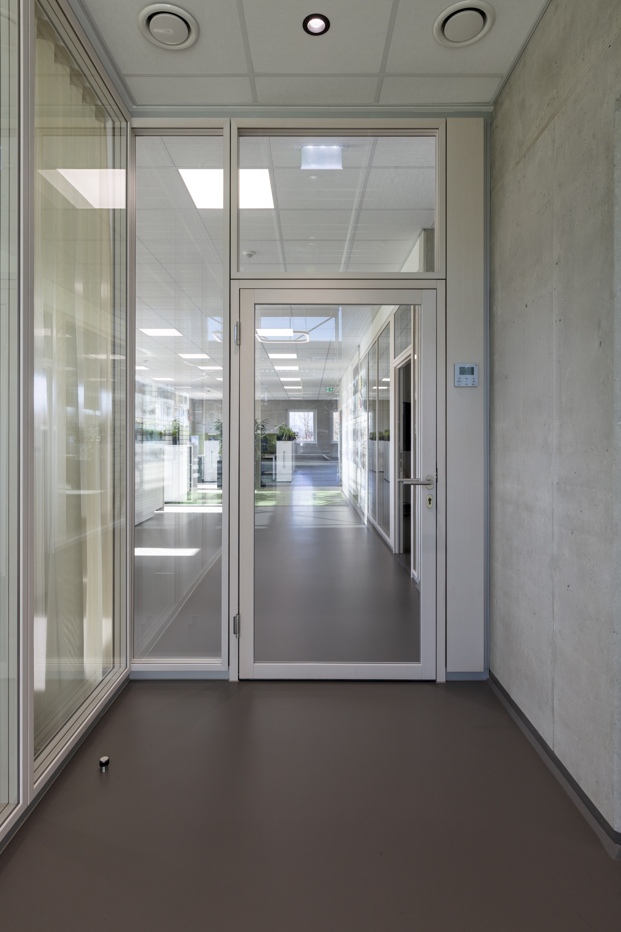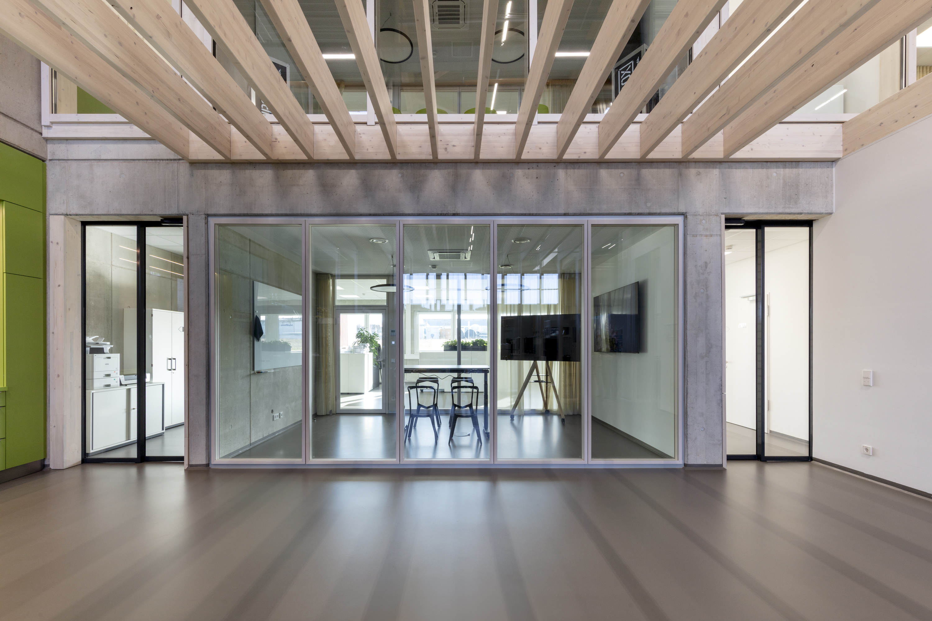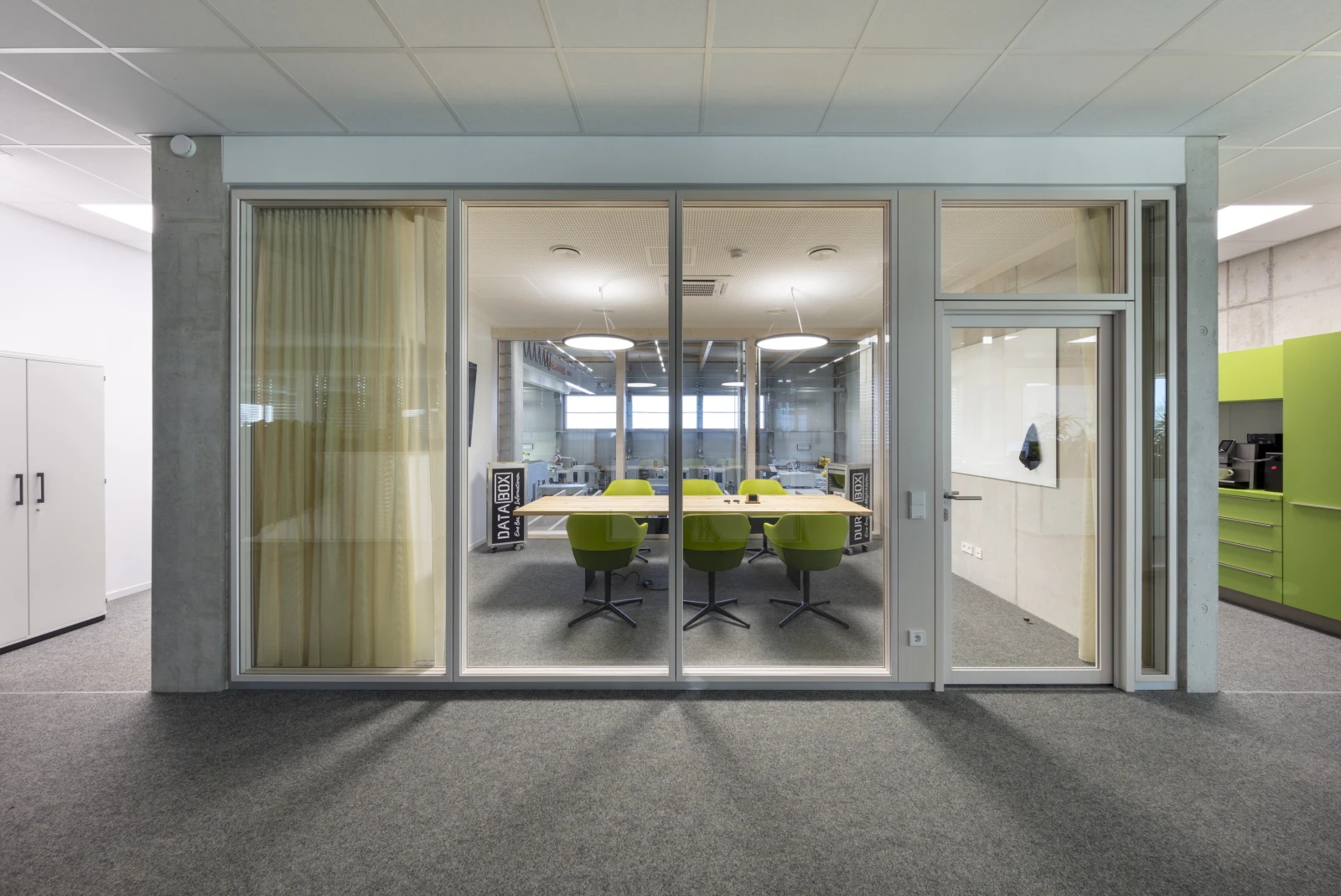 The project placed particular emphasis on sustainability. The new building meets modern energy standards and creates the ideal conditions for future-oriented work processes. The 2000_Nature partition wall system makes a significant contribution to the system walls’ CO2-reduced and long-term design. The system’s glazing frames and door frames consist of a veneered solid wood profile. In this project, these were finished with a white-pigmented spruce veneer.