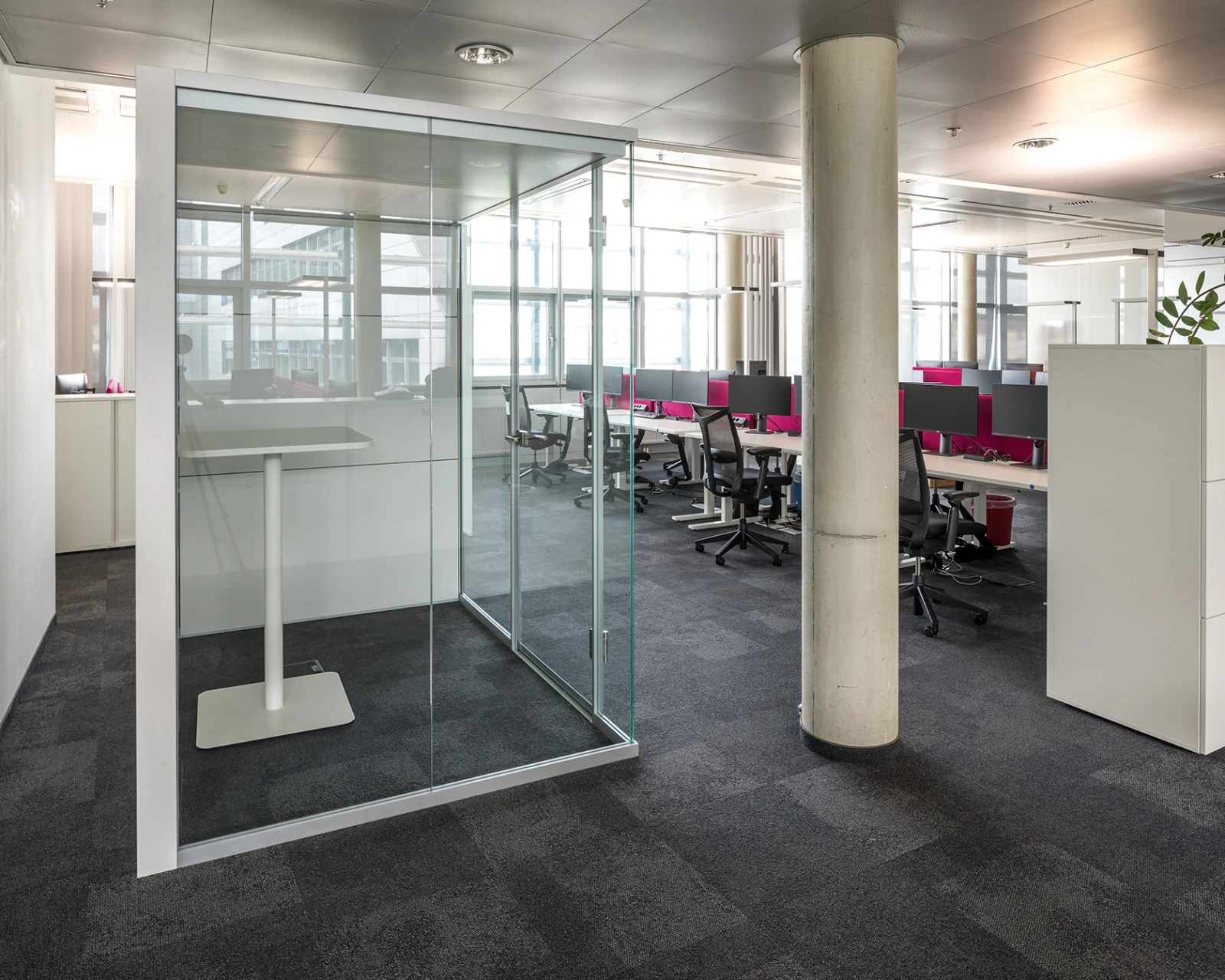 The T-Center belonging to Deutsche Telekom is an office building in the Sankt Marx district of Vienna. In the office areas of T-Systems Austria, inside has erected seven Kubus I Micro rooms as spaces for retreat. Regardless of whether it is used as an individual workplace where staff can really concentrate, or for making phone calls and holding video conferences undisturbed: Kubus can be used flexibly and provides good sound insulation.
