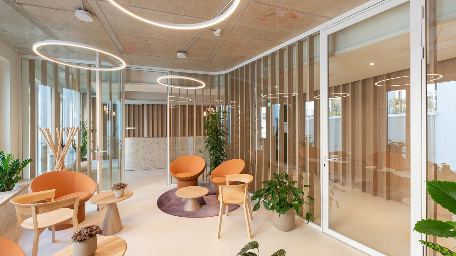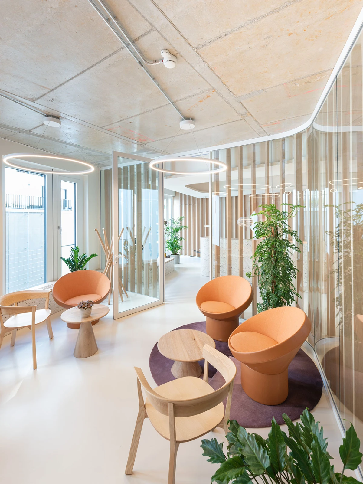 The curved glass partition walls in the practice’s waiting room were designed using System 3400 in white. The slim 40 mm aluminium frame doors, also in white, ensure both discretion and transparency. 16 mm VSG-SI glass was used for increased sound insulation in the treatment rooms.