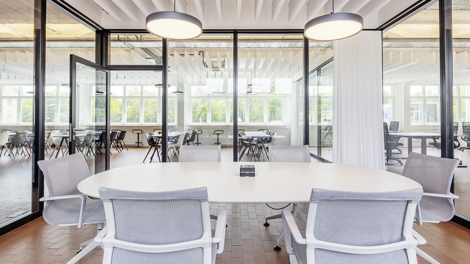 The offices of Zoi TechCon GmbH are in line with the industrial nature of the area, thanks to the black profiles of Partition Wall System 2000. The flush glazing provides a transparent appearance and a high level of sound insulation, and enables a combination of sheltered workplaces and communicative areas for informal chats among staff. Room-high glass elements combined with top-light elements bring light into the offices and create a bright, open atmosphere.