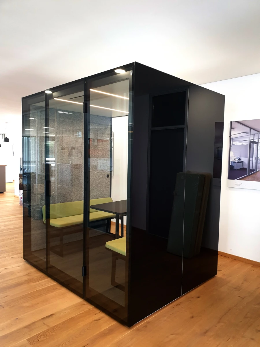 Dank Ihrer flächenbündigen Verglasung entsteht eine transparente, schallgedämmte Insel, die auf Wunsch per Vorhang auch Diskretion ermöglicht. Die stufenlos steuerbare Lüftung und Beleuchtung erlauben je nach Nutzung ein individuelles Wohlfühlambiente.