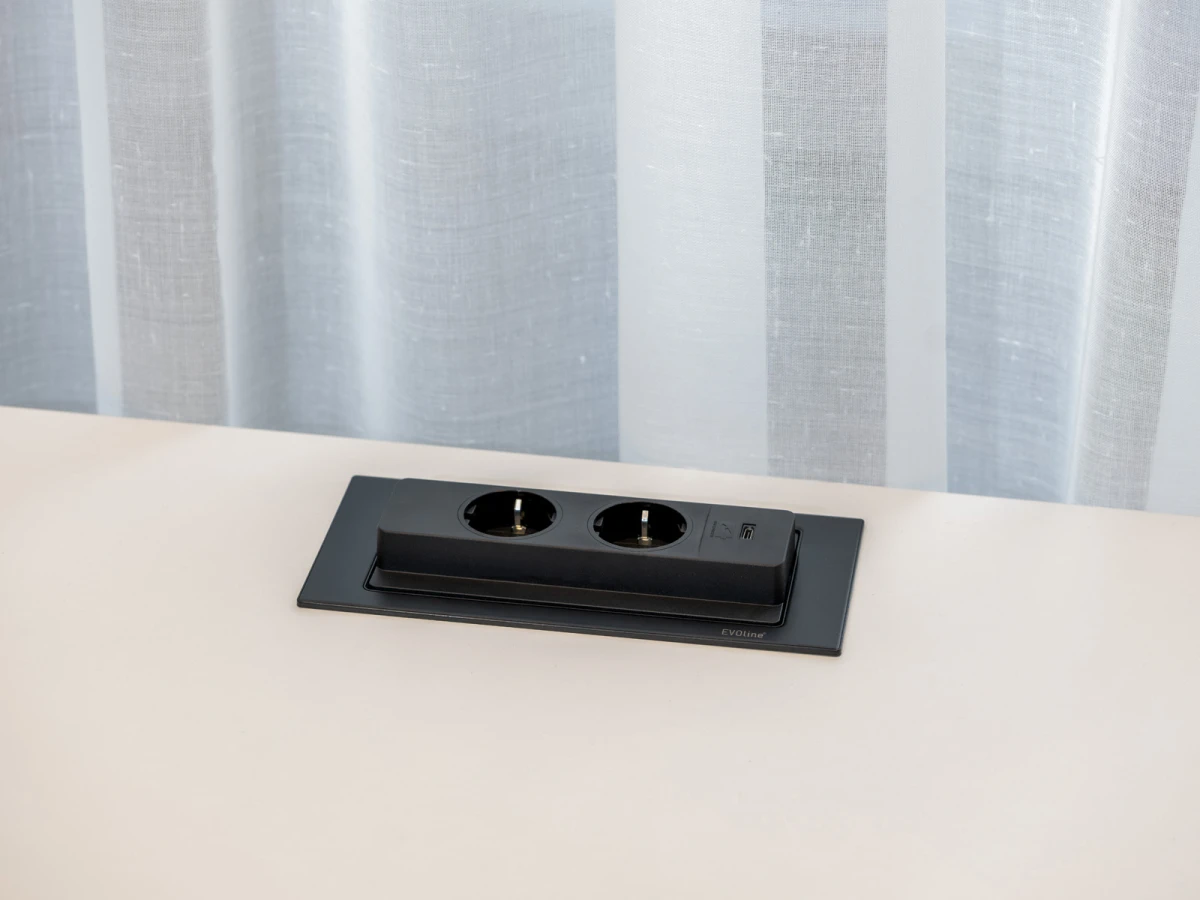 - 2 Einzelsteckdose in der Wand, optional in Tisch integrierte Steckdosenleiste mit USB-C