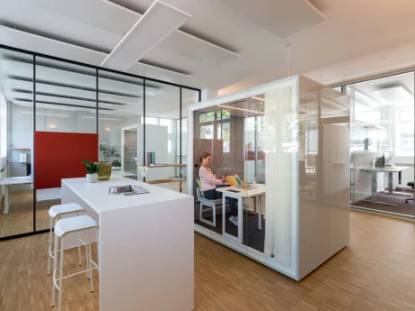 Die TEAMBOXEN benötigen keinen Anschluss an Bauteile wie Fassade, Wand oder Decke. Sie sind flexibel konfigurierbar, hochschallgedämmt und äußerst funktional ausgestattet.