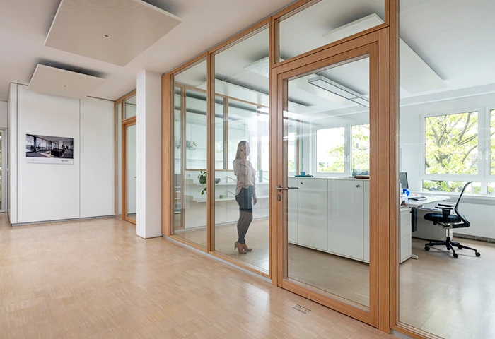 Die flächenbündige Glastrennwand mit eleganter Holzrahmenkonstruktion erhöht den Anteil an nachwachsenden Holzwerkstoffen in der Systemwand deutlich. System 2000_Nature unterstützt Innenraumkonzepte, die auf eine warme, wohnliche Atmosphäre abzielen. Die Holzrahmen bestehen aus einem Echtholzprofil welches überfurniert wird. Der modulare Aufbau gewährleistet, dass das System jederzeit auf einfachste und wirtschaftliche Weise an neue Anforderungen anpassbar und per se kreislauffähig ist.