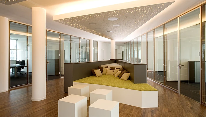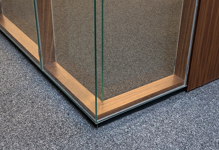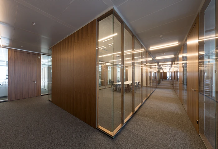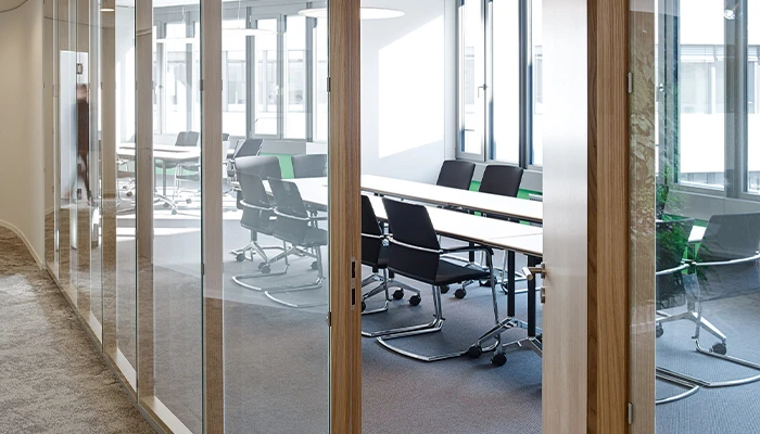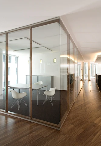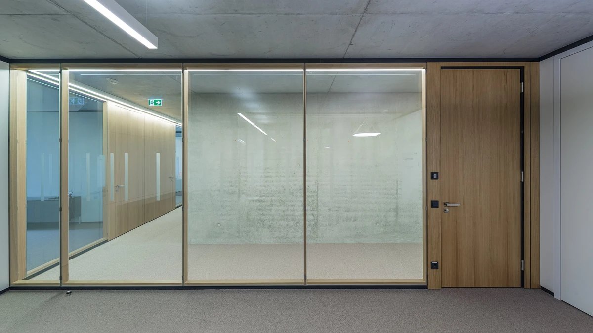 Trennwandsystem in Holzpfosten-Riegelbauweise mit flächenbündiger Verglasung.