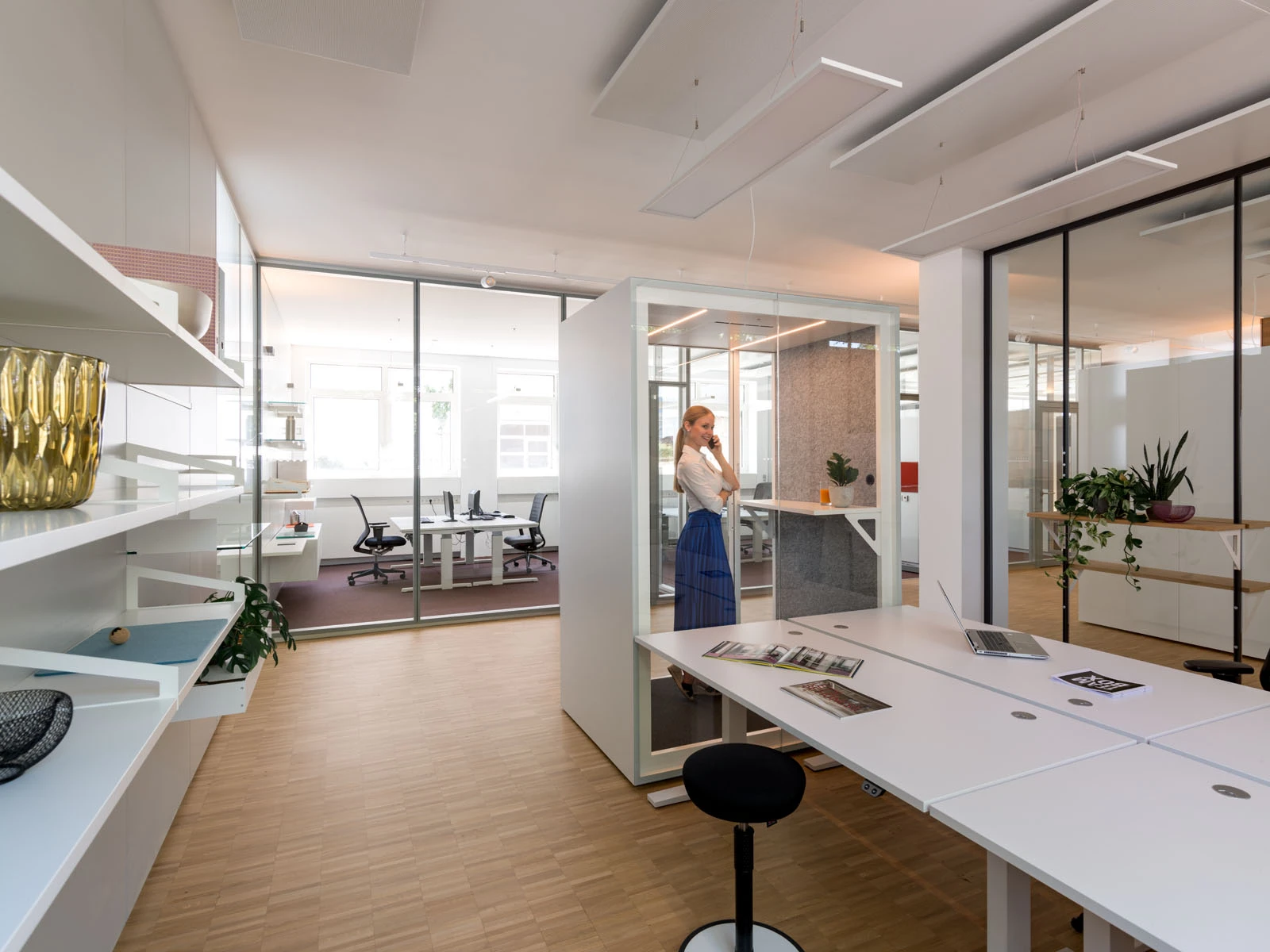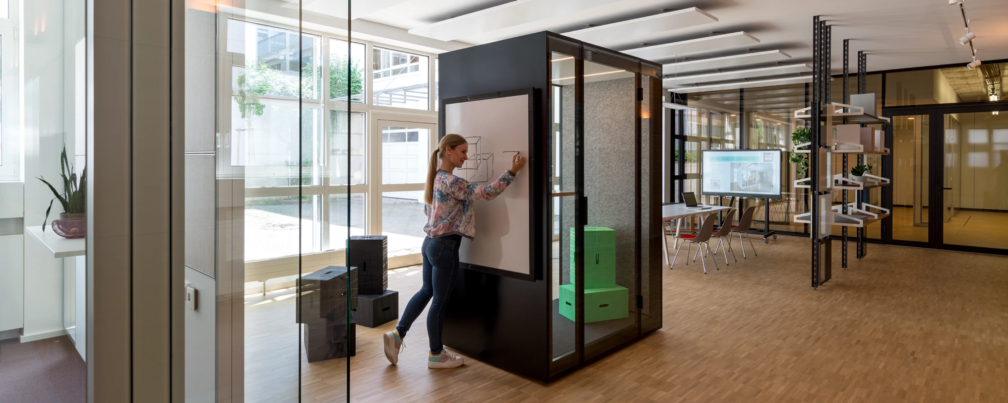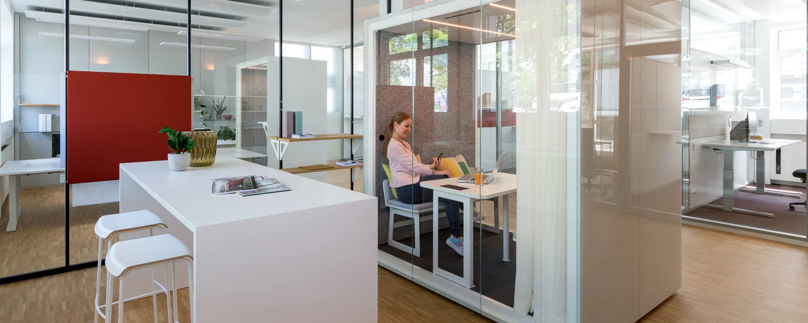 Die neu konzipierte Fläche bietet fließende Übergänge zwischen offenen Besprechungsbereichen und akustisch abgeschirmten Zonen für Projektarbeit. Darin integriert finden sich Raum-in-Raum-Systeme der neuen Modellreihe TEAMBOX by Strähle als Orte für konzentriertes Arbeiten und Videomeetings.