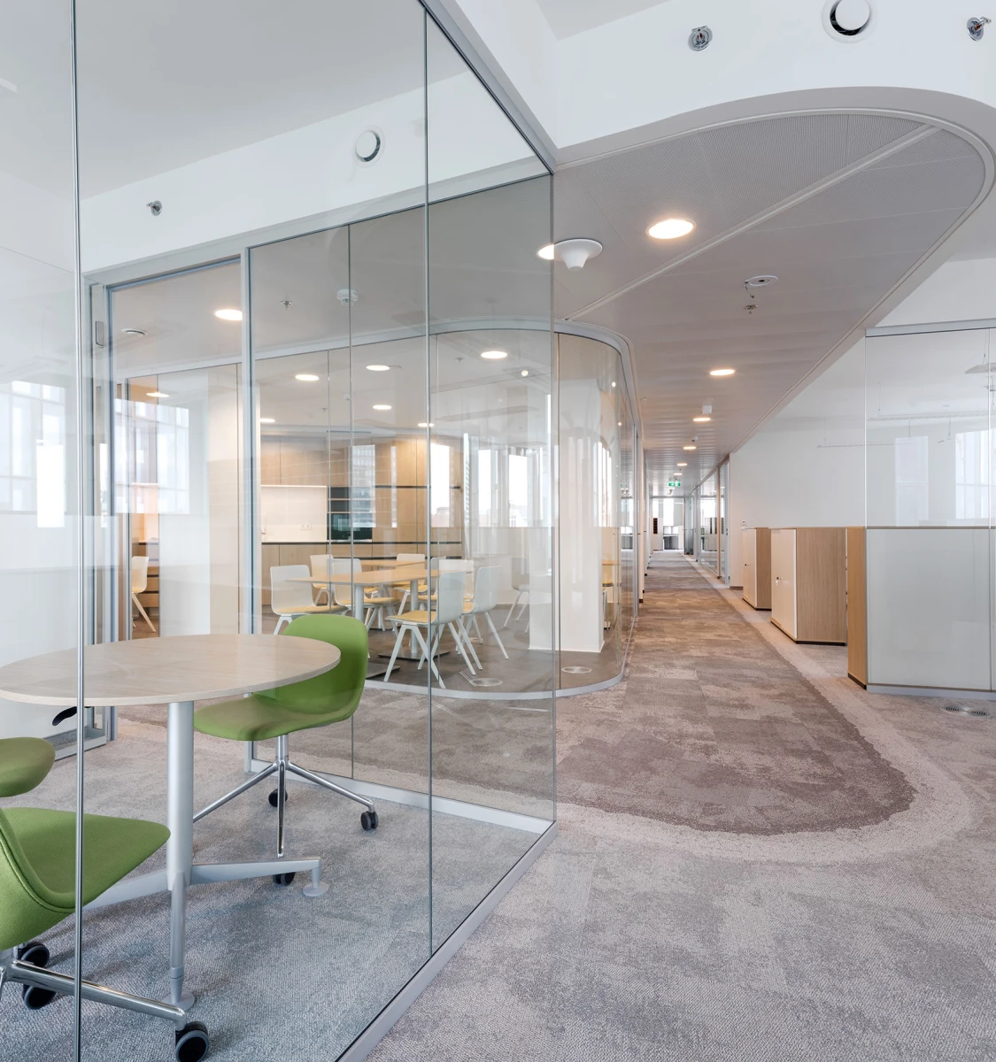 Glastrennwände von Strähle kommen sowohl im Atrium als auch in allen Bürobereichen zum Einsatz. Die Abtrennung zum lichtdurchfluteten Atrium wurde mit absturzsichernden Glaswänden ausgeführt und ermöglicht einzigartige Sichtbezüge zur markanten Fassade. Je nach Schallschutzanforderung wurden die Ganzglaswände in den Systemen 3400 und 3500 mit Einfach- bzw. Doppelverglasung ausgeführt. Ohne vertikale Profile stehen beide Systeme für maximale Transparenz und Reduktion auf das konstruktive Minimum. In den Bürobereichen wurden unterschiedliche Raumtypen realisiert, um eine langfristig flexible Nutzung zu gewährleisten.