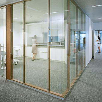 Bei neuen organisatorischen Anforderungen lassen sich die Systeme dank der bewusst einfachen Fügung der Komponenten und Materialien leicht umbauen. Durch seine gestalterische Qualität fördert System T das Wohlbefi nden der Mitarbeiter. Die natürlichen Holzoberfl ächen erzeugen eine angenehm warme Atmosphäre. Die flächenbündige Doppelverglasung sorgt für Transparenz bei gleichzeitig hohen Schallschutzwerten (bis 44 dB).