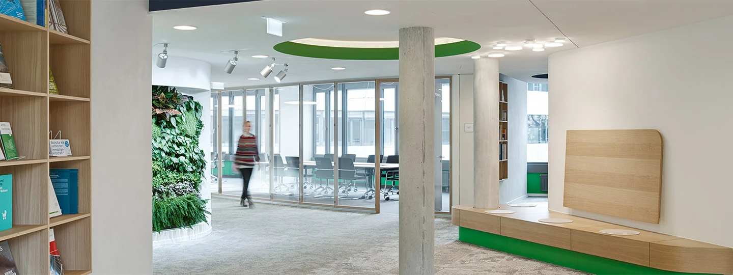In den Räumlichkeiten der Deutschen Gesellschaft für Nachhaltiges Bauen DGNB wird nachhaltiges Bauen direkt erlebbar. Den äußeren Rahmen bildet der mit dem DGNB-Gütesiegel ausgezeichnete Neubau „Caleido“ im Herzen Stuttgarts. An der Innenraumgestaltung unter der Regie des Architekturbüros urban matters UMnet beteiligten sich mehr als 30 Mitgliedsunternehmen. Mit ihren Produkten und ihrem Wissen entstand ein Living Showroom, in dem alle Aspekte des nachhaltigen Bauens in die Praxis umgesetzt sind. Die flurseitige Abtrennung der Büround Besprechungsräume übernehmen Glaswände aus dem System T von Strähle. Das in Holzpfosten-Riegel-Bauweise gefertigte Trennwandsystem erfüllt die von der DGNB in den Themenfeldern Ökologie, Ökonomie, soziokulturelle und funktionale Aspekte sowie Technik beschriebenen Anforderungen.