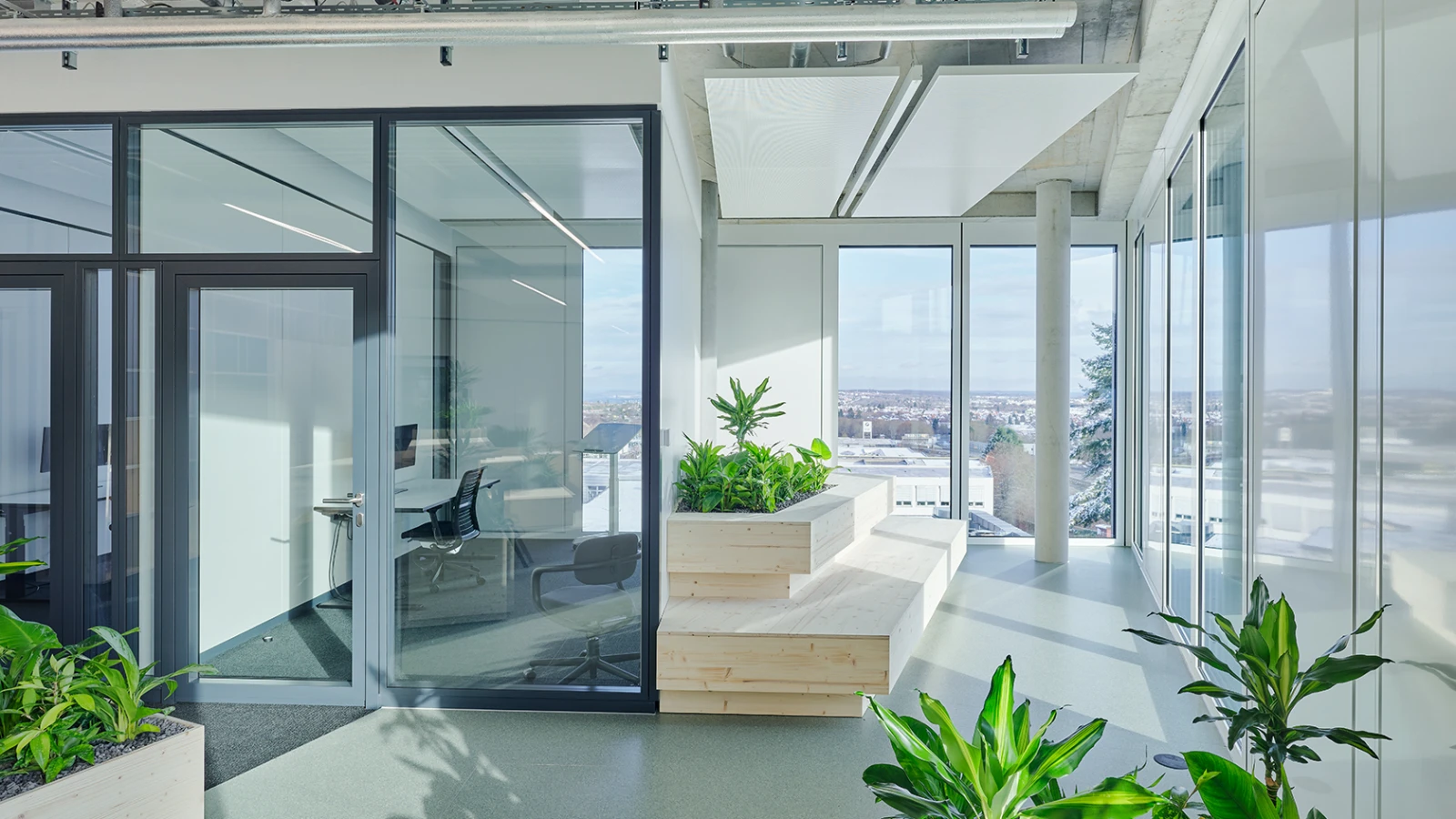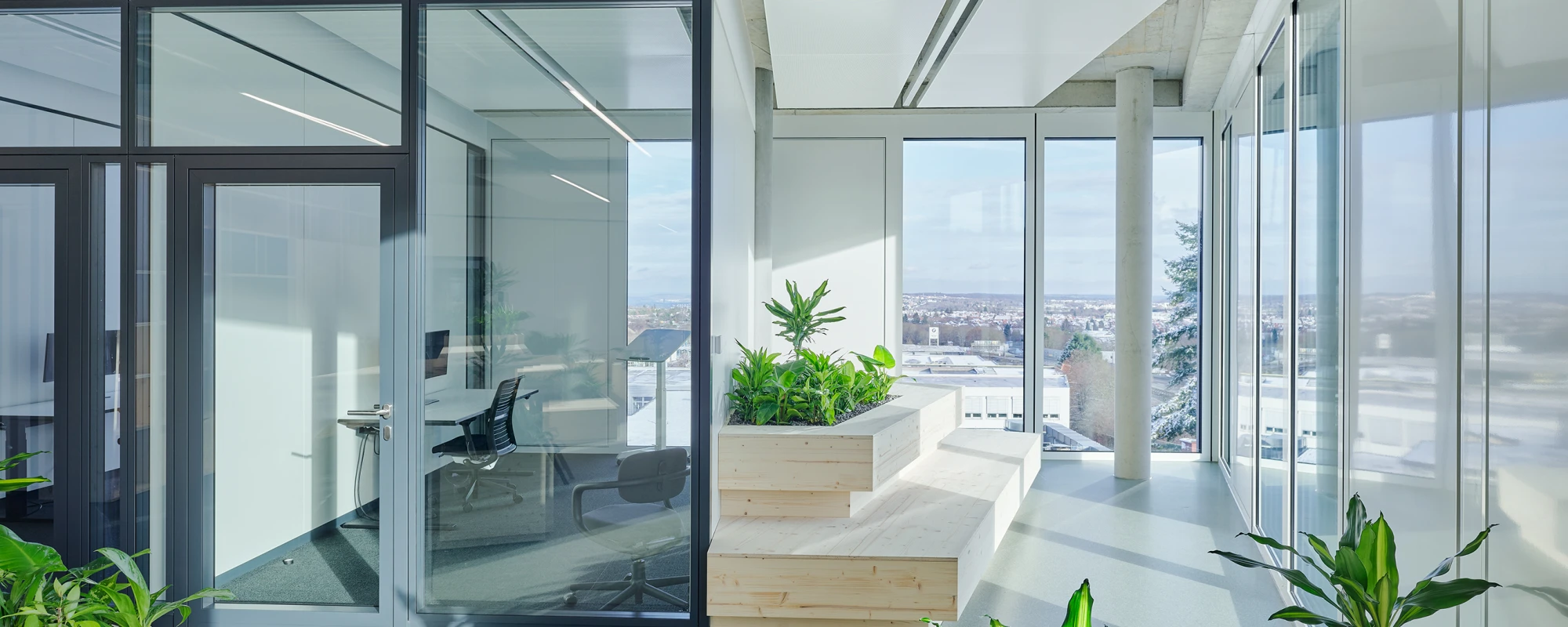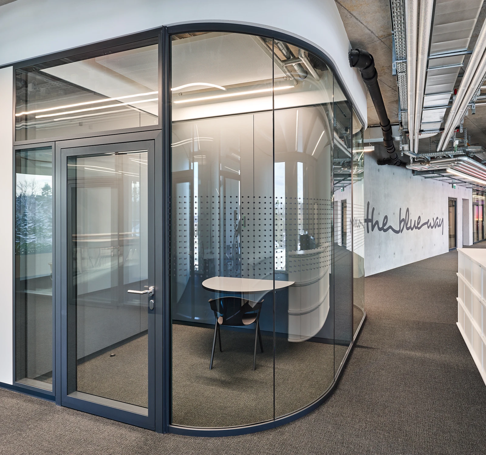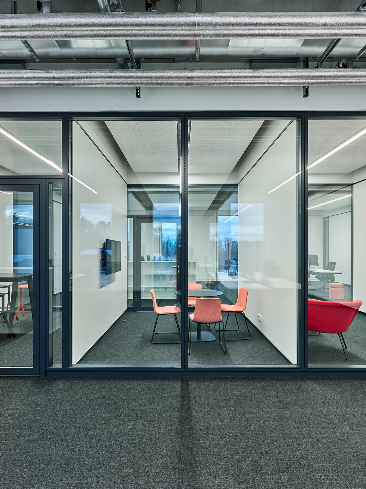 Die Cradle-to-Cradle zertifizierten Trennwandsysteme 2000eco sowie 3400eco von Strähle entsprechen den ökologischen und ökonomischen Vorgaben und wurden im gesamten Gebäude umgesetzt. Bei sehr hohen Schallschutzvorgaben kam das doppelverglaste System 2000eco in Verbindung mit Alurahmentüren zum Einsatz.
