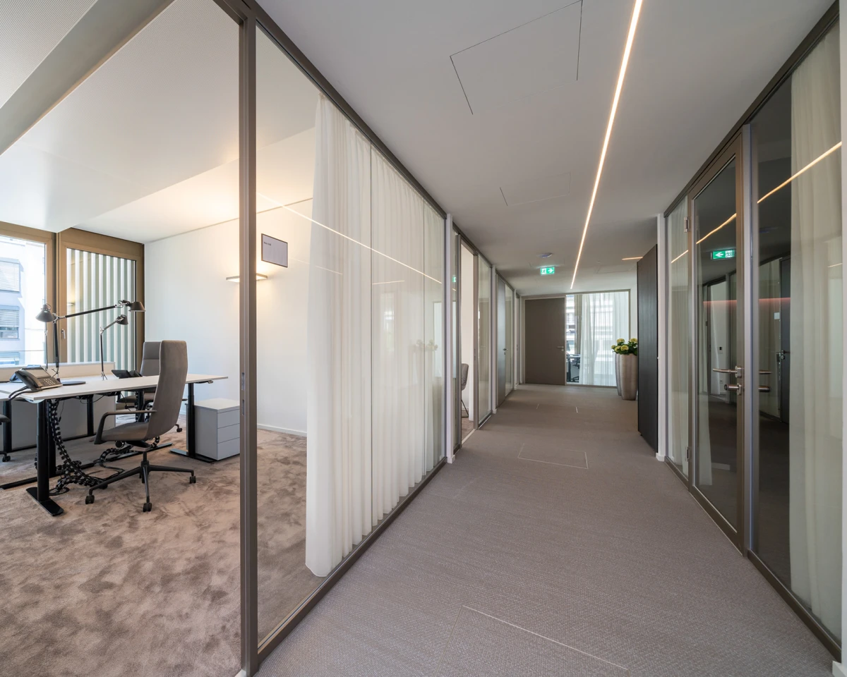 Im gesamten Gebäude wurde das zweischalige Trennwandsystem 2300 mit schwarzen Profilen verbaut. Für erhöhten Schallschutz sorgen die 100 mm Alurahmentüren die beidseitig flächenbündig eingebaut wurden. In den Türseitenteilen wurden Raumbuchungssysteme integriert, die eine digitale Steuerung der Räume ermöglicht