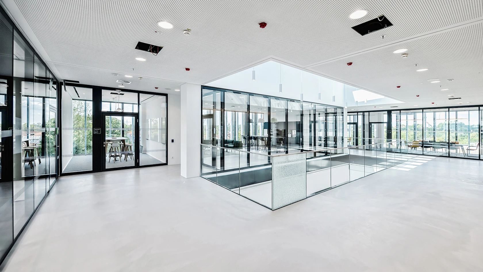 Zwei absturzsichernde Wände von zehn und zwölf Meter Länge im Bereich der Treppen sorgen für Transparenz und Diskretion zu den Flurbereichen. Entstanden ist ein offenes und inspirierendes Zentrum mit einer hochmodernen Infrastruktur.