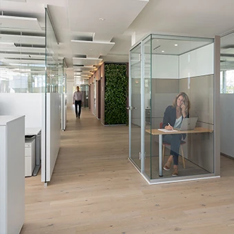 Jedes Raumkonzept muss perfekt zu den Bedürfnissen der Mitarbeiter passen. Optisch ist er dem Ambiente des benachbarten Containerhafens nachempfunden: Maßgefertigte offene Räume im Look von Seecontainern nehmen Schreibtische auf. Als Rückzugsorte für Besprechungen und Telefonate stehen verschiedene Raum-in-Raum Systeme von Strähle zur Verfügung. Das System Kubus I mit schwarzen Profilen und stoffbespannten Absorbern sowie Vorhängen nimmt das Konzept aus Industrieflair und Wohnlichkeit gestalterisch auf. Die Glaskuben integrieren dabei wichtige Funktionen wie Lüftung, Schallschutz, Raumakustik, Beleuchtung und Multimedia.