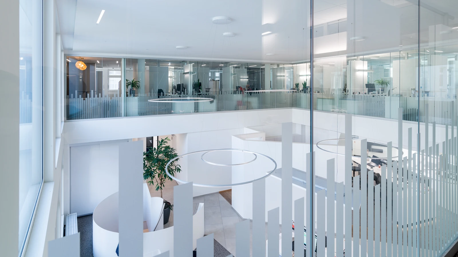 In beiden Filialen wurden die offenen Büroflächen mit der Glasakustikwand 7400 von Strähle gestaltet. Durch die Kombination von vertikal angeordneten Absorbern und Glaselementen entstehen akustisch voneinander getrennte Zonen, die individuellen Rückzug ermöglichen.