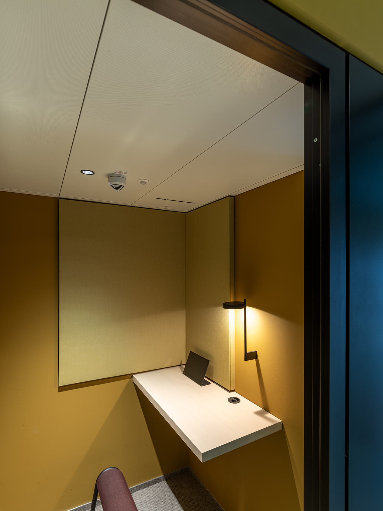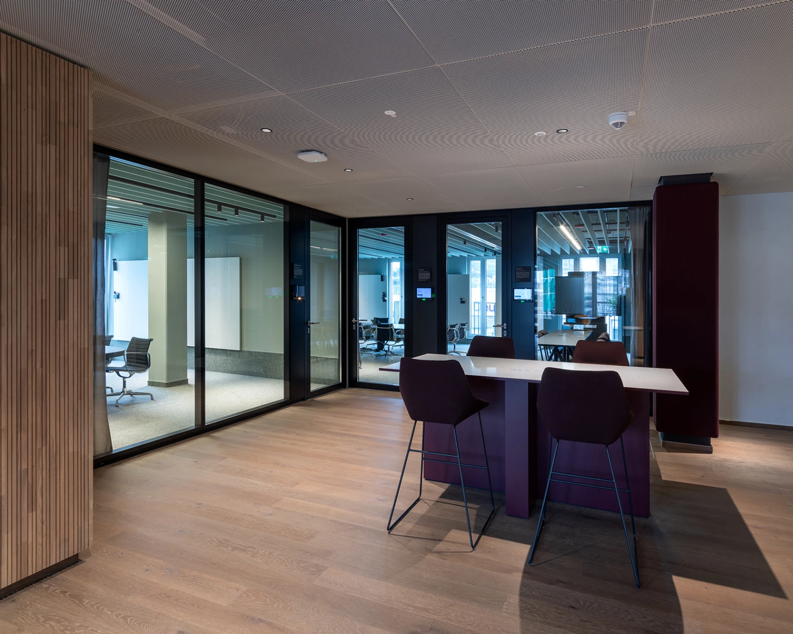Die schwarz eloxierten Profile der Glaswände korrespondieren dabei mit den farbigen geschlossenen Wänden sowie der Möblierung und sorgen für ein elegantes Ambiente. Diskretion und Vertraulichkeit ermöglichen die raumhohen Volltüren und die hochschallgedämmten 100 mm Alurahmentüren die beidseitig flächenbündig in die Systemtrennwand integriert sind.