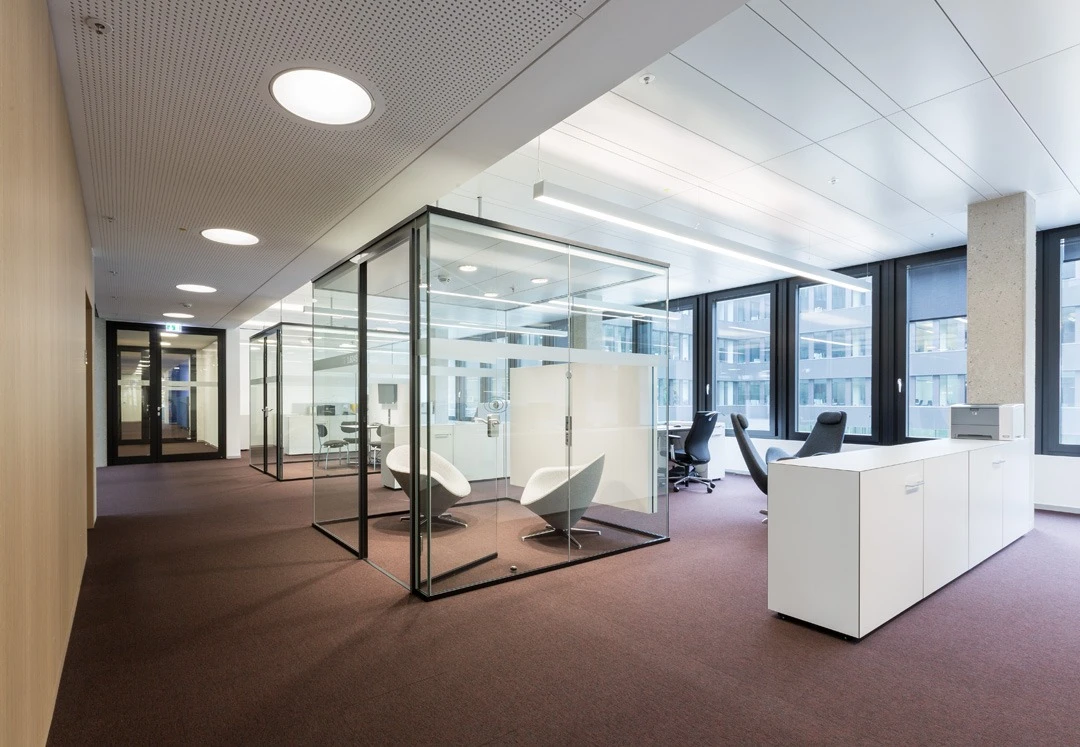 Das Konzept der Architekten Sauerbruch Hutton sah vor, das Verwaltungsgebäude aus den 80er Jahren mit einer innovativen, mehrfarbigen Fassade nach außen hin zu öffnen und besser in sein städtisches Umfeld zu integrieren. Im Mittelpunkt stand neben der Optimierung der Energiebilanz vor allem auch die räumliche und ökologische Verbesserung der Büroflächen. Das Bürokonzept verbindet verschiedene Büroformen, wie Kombi-, Open-Space- und Konferenzbereiche. Realisiert wurde dies mit Voll- und Glaselementen aus dem Trennwandsystem 2000 sowie dem einfach verglasten Raum-in-Raum System Kubus I. Über 70 Kuben fügen sich durch ihre Transparenz harmonisch in die offenen Bürobereiche und gewährleisten mit hohen Schallschutzwerten sowie der integrierten schallgedämmten Belüftungseinheit einen hohen Komfort für die Mitarbeiter.