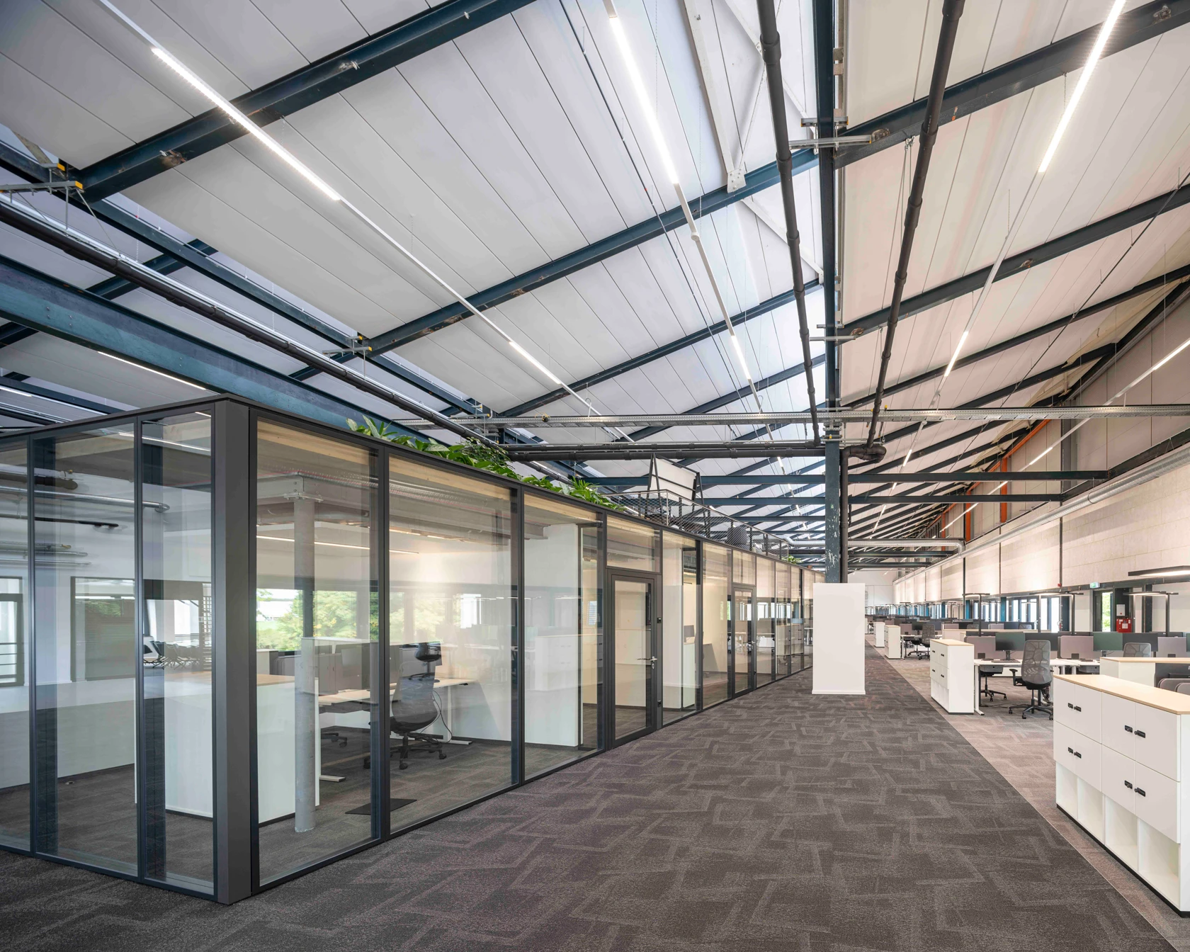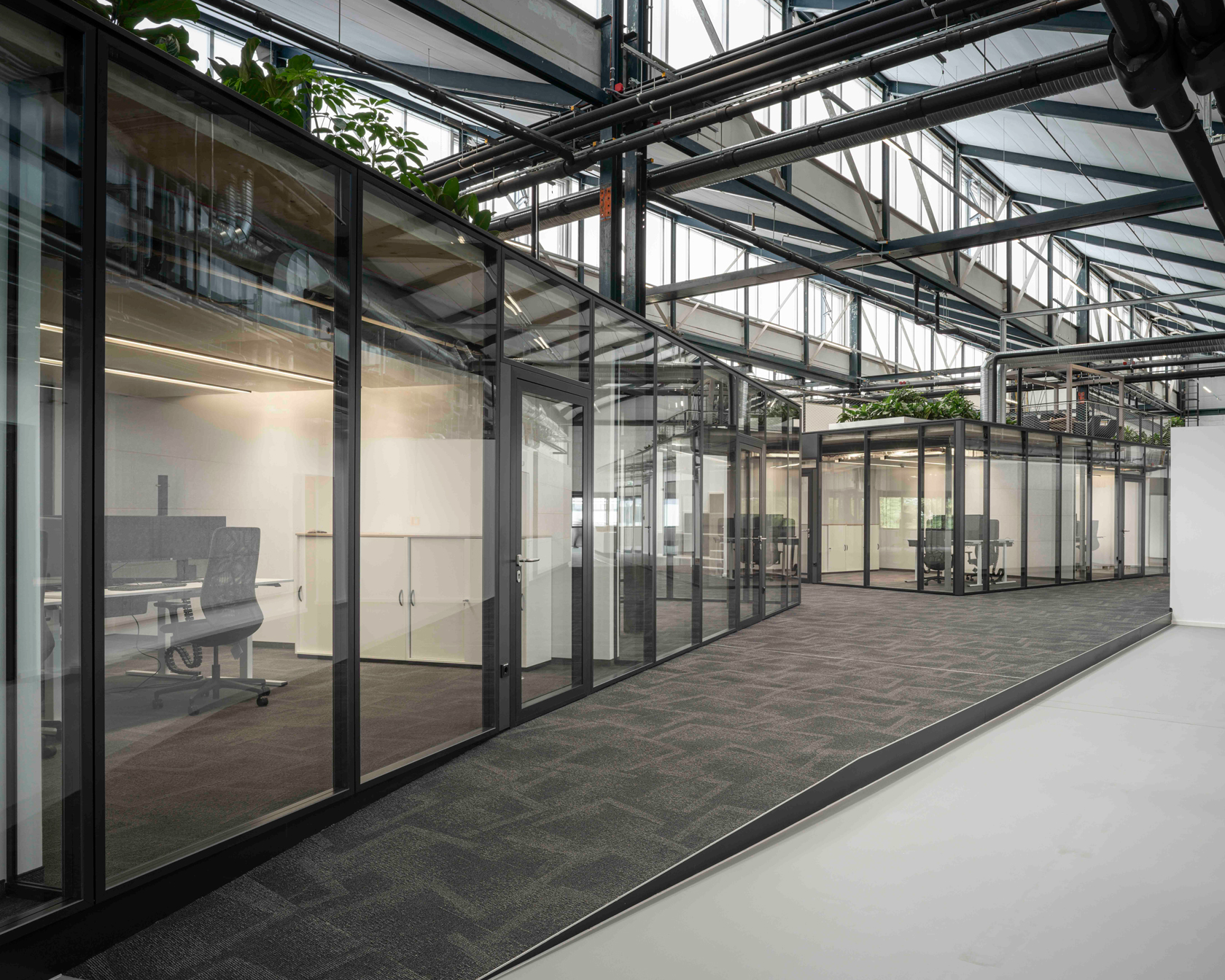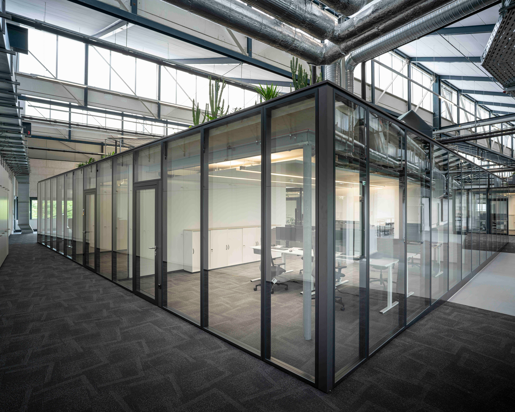 Für die Abtrennung von Büros und Konferenzräumen wurden Glastrennwände aus dem System 2000 eingesetzt. Sie verbinden exzellente Schalldämmung mit hoher Transparenz und sorgen so für ein lichtdurchflutetes Ambiente. Insgesamt wurden 274 laufende Meter Glaswand verbaut.