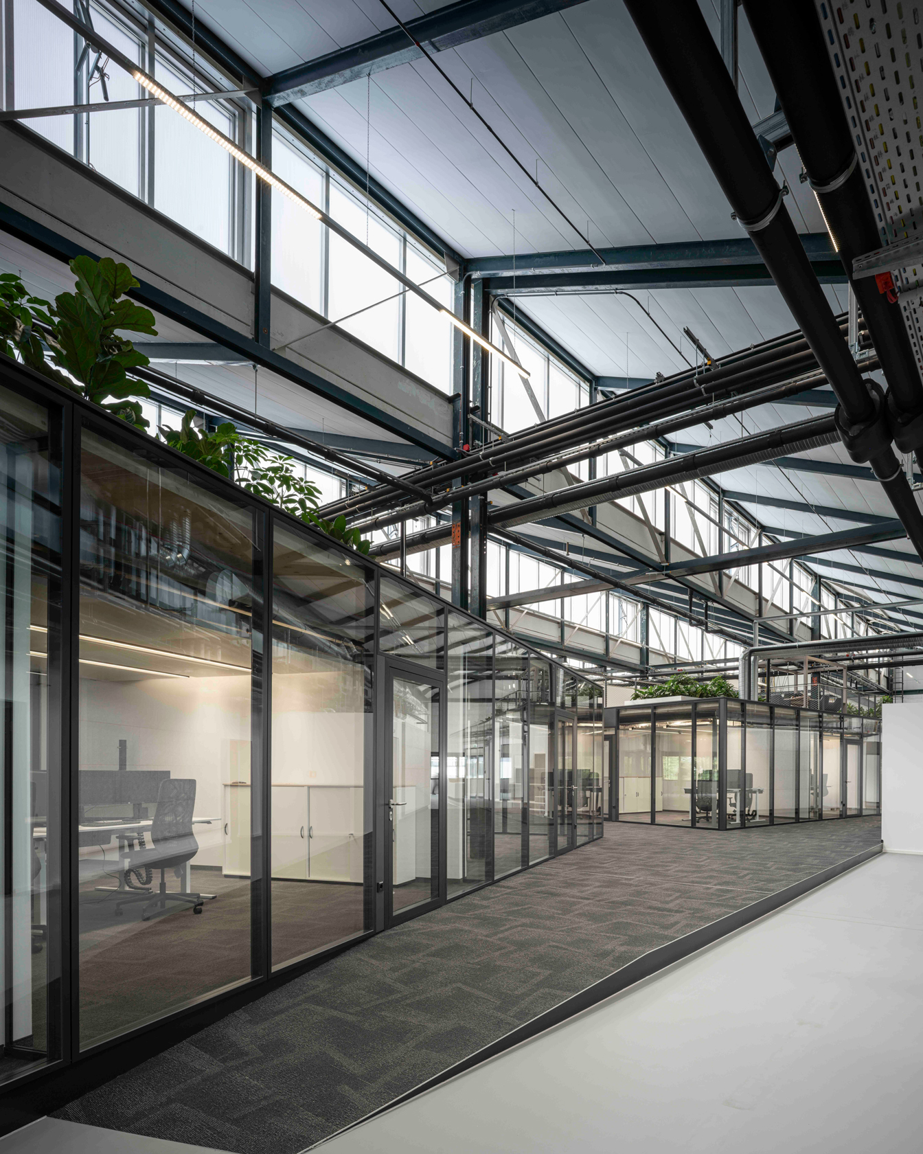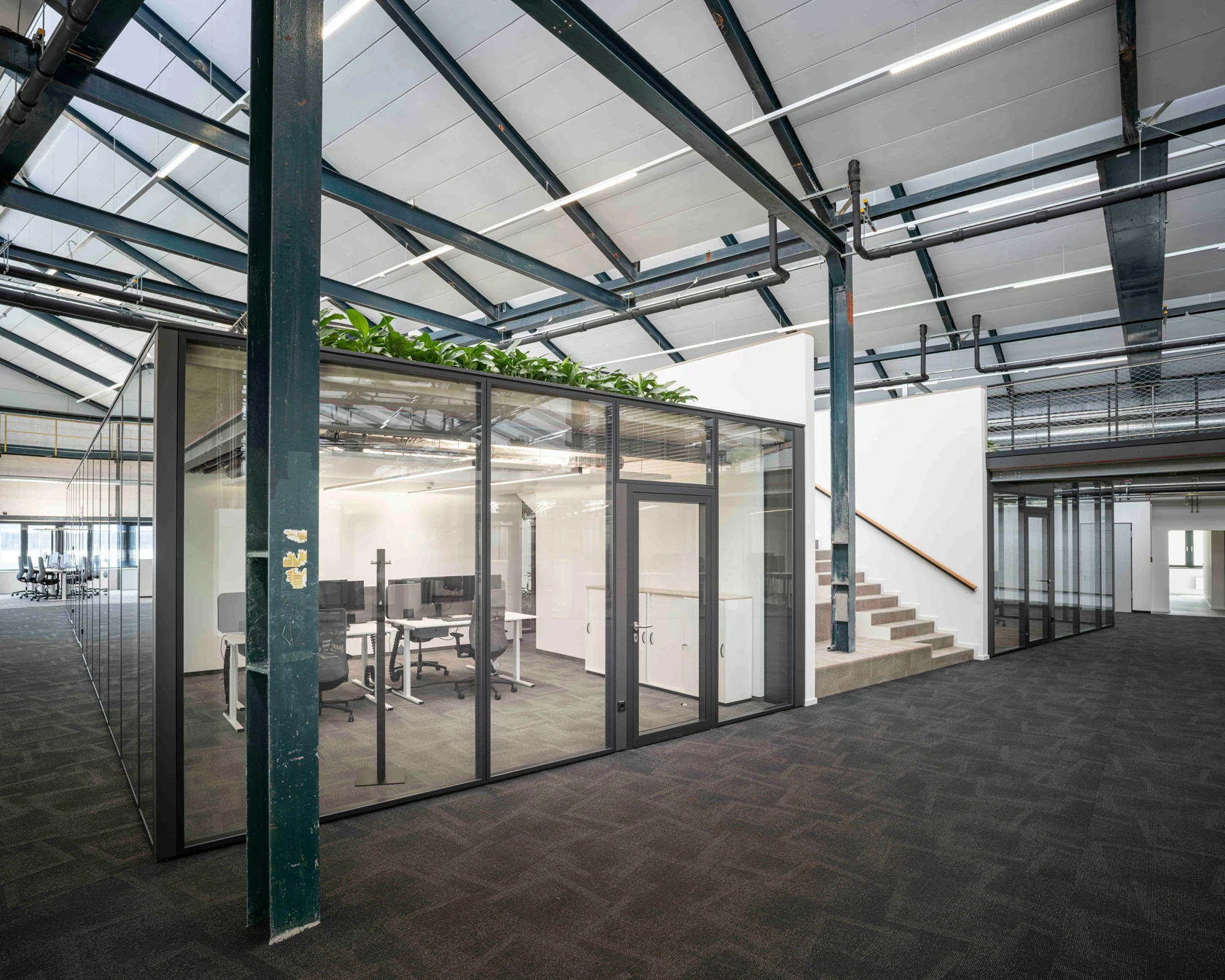 Insgesamt wurden drei über das Geschoss verteilte Büroinseln installiert. Jede bietet sechs in Stahlkonstruktion gefertigte Büro- respektive Konferenzräume, die um einen innenliegenden Lichthof angeordnet sind. Die Elektrifizierung der Büroinseln fand über eigens dafür installierte Hohlraumböden statt.