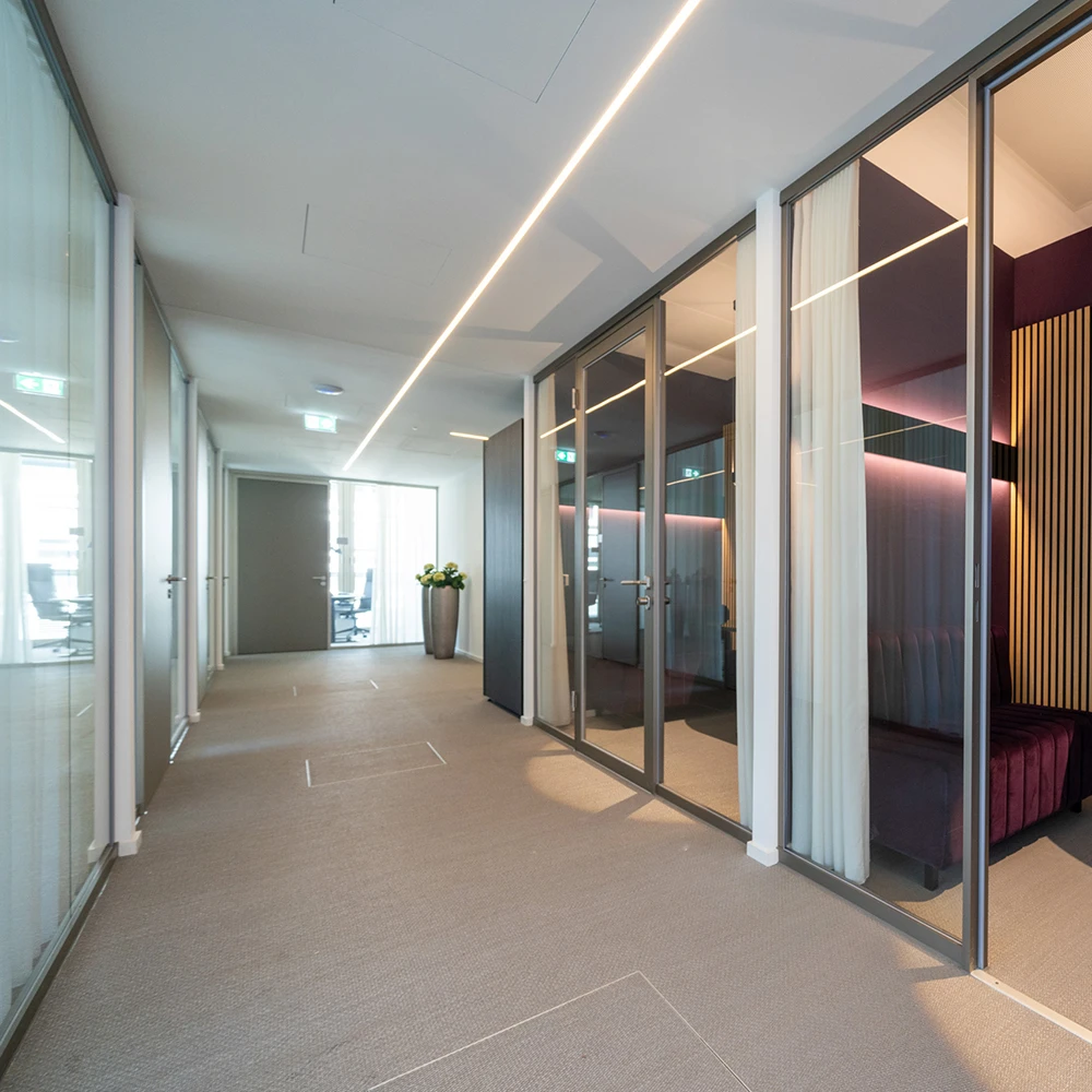 Seit 1959 hat die OeKB ihren Sitz in der Wiener Strauchgasse. Im Zuge des Umbaus „Future Office Rollout Phase 2“ hat unser österreichischer Partner inside Trennwandsysteme am Standort das Structural-Glazing-System 2300 in schwarzer Verklebung mit SG100 Türen verbaut. Das System 2300 zeichnet sich durch seine spiegelnde Glasoptik aus und überzeugt mit hohen Schallschutzwerten. Es ist hochflexibel und modular aufgebaut und basiert auf dem patentierten Strähle Systemständer mit integrierter Einhängevorrichtung. Durch die modulare Bauweise sind verschiedene Elementtypen wie Oberlicht-, Brüstungs-, und Ganzglaswände möglich.