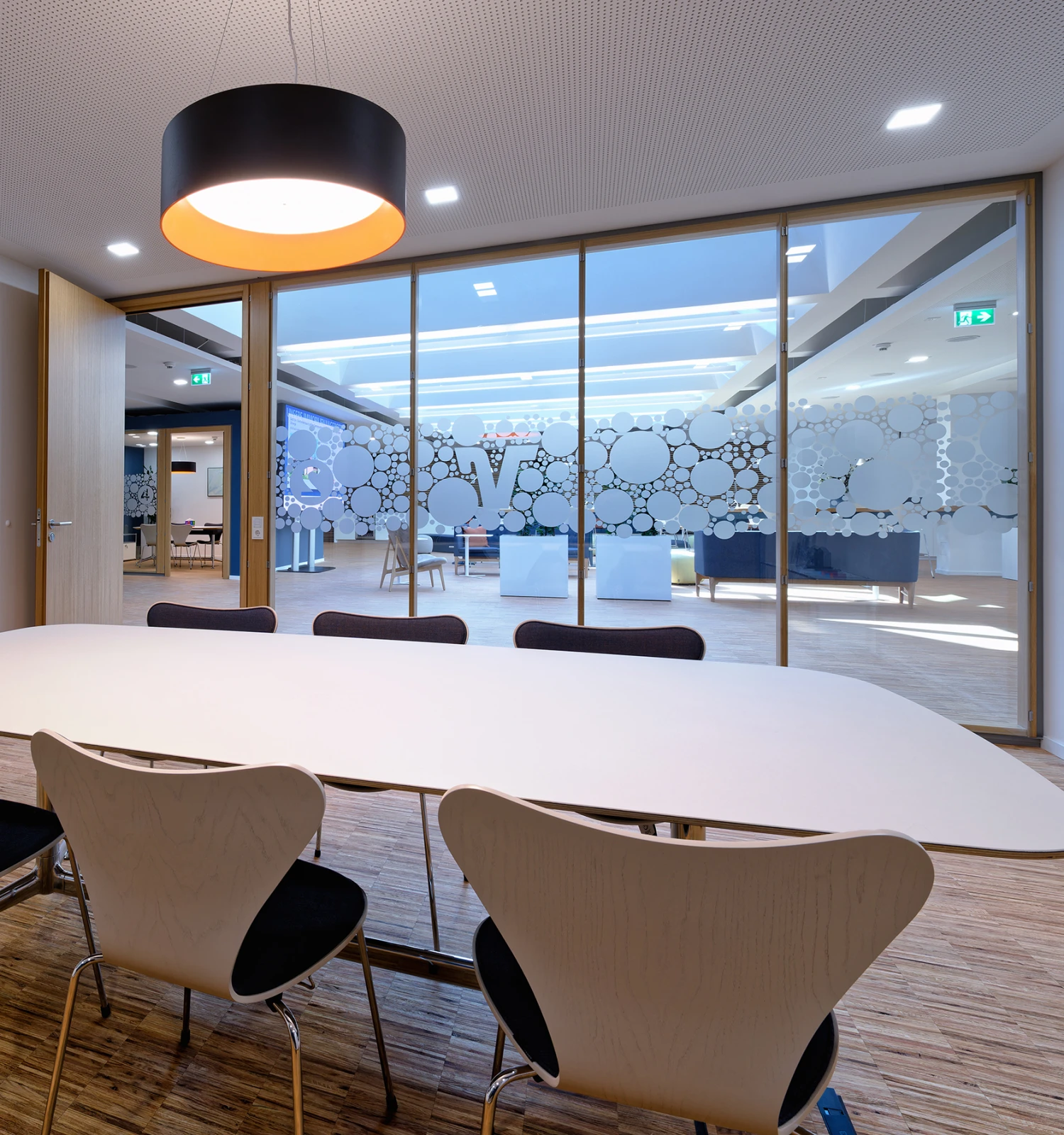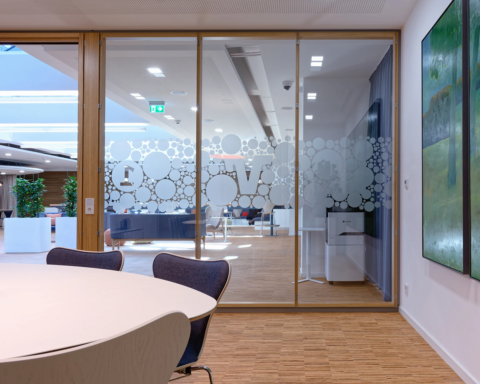 Warme, natürliche Materialien gehen heute einen Dialog ein mit den erhaltenen Sichtbeton- und Mauerwerkswänden aus dem Bestand und dem farblich überarbeitetem Corporate Identity der Bank. Ein flexibles Innenraumkonzept mit einheitlicher Möblierung liegt über den vielen unterschiedlichen Etagen und Abteilungen: Eine offene Bürolandschaft mit Begegnungszonen und Rückzugsräumen, formellen und informellen Besprechungsorten. Die neuen Büroräume der Mitarbeiter wurden mit dem Trennwandsystem T von Strähle in heller Holzoptik gestaltet. Folierungen an den Ganzglaswänden sorgen für Orientierung und Diskretion.