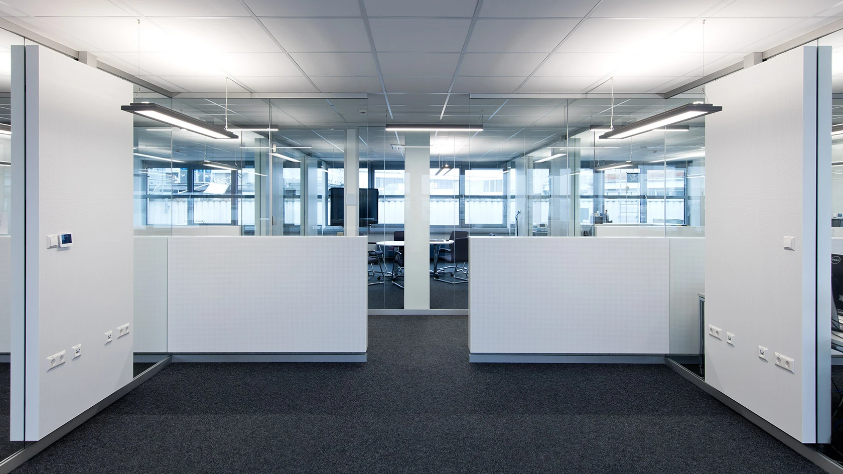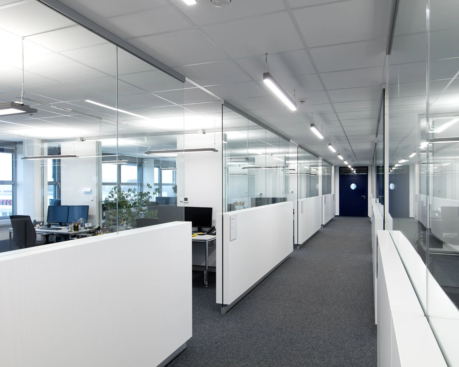 In Kombination mit der bauseits installierten akustisch wirksamen Decke wurde damit eine angenehme und geräuscharme Arbeitsumgebung geschaffen. Zudem kann das Tageslicht durch die vielen Glasflächen und halbhohe Absorberelemente entlang der Flurwände ungehindert in den Raum dringen.