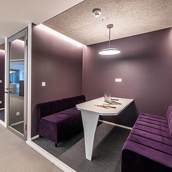 In jeder Etage wurden die beiden Raum-in-Raum-Systeme in hellen und dunklen Varianten mit verschiedenen Holzoberflächen realisiert und dienen dadurch als markante Gestaltungselemente. Die Kubus Systeme besitzen eine integrierte Belüftung und LED-Deckenleuchten sowie USB Anschlüsse.