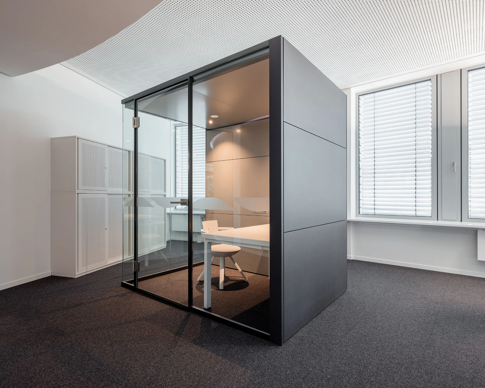 Telefonate können die Mitarbeiter im kompakten Kubus I Micro führen, ohne die Kollegen in den angrenzenden Bürobereichen zu stören. Für Besprechungen zu zweit und Videokonferenzen ist der Kubus I Dialog vorgesehen.