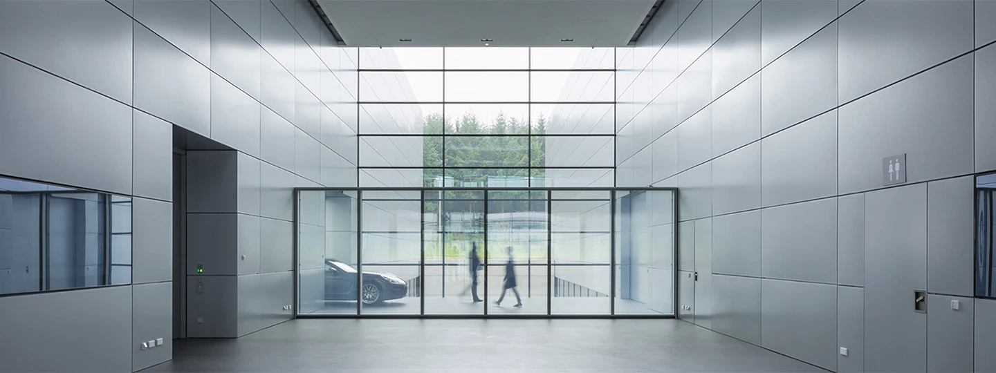 Im Porsche Design Studio werden Bereiche zusammengeführt, die in der frühen Phase der Entwicklung eng zusammenarbeiten. Herz des Gebäudes ist die großzügige Treppe, die mit unterschiedlichen Stufenhöhen und Sitzgelegenheiten als wichtiger Kommunikationsort für die Mitarbeiter dient. Die Büroräume sind mit Trennwänden des Systems 2300 gegliedert. Die filigranen Profile und die flächenbündige Verglasung bestimmen das Ambiente. Besonders markant sind die schwarze Structural-Glazing- Verklebung und die Portaltüren. Eine Besonderheit in dieser Ausführung des Systems 2300 ist die schaltbare elektrochrome Verglasung.