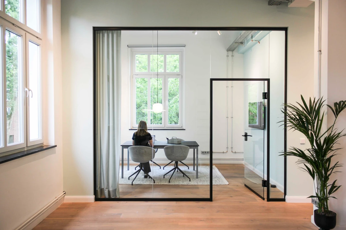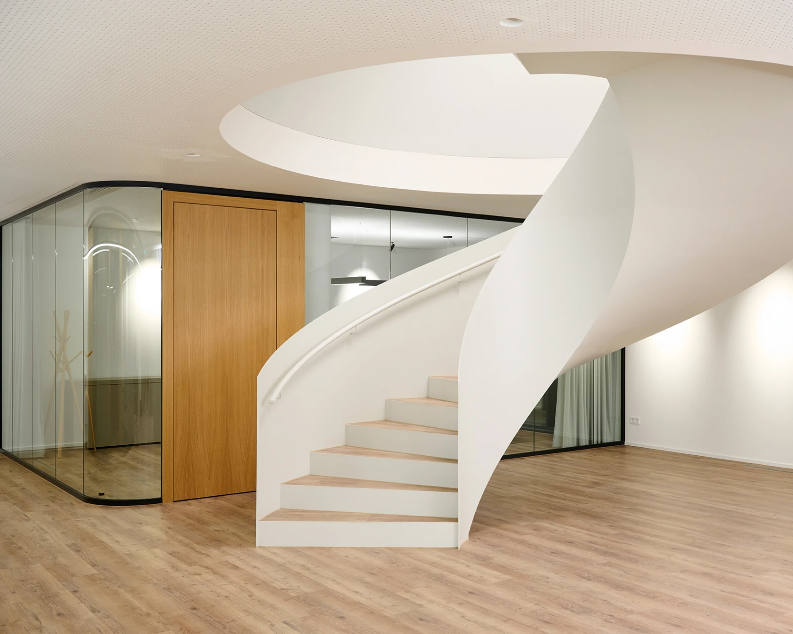 Gebogene Glaswände von Strähle verleihen den Räumen Dynamik, schwarze Profile bilden einen spannenden Kontrast zu den wohnlichen Materialen und Farben. In der Open Space Zone befinden sich die einzeln angeordneten Arbeitsplätze, die dank ihrer akustischen Abschirmungen für eine hohe Intimität und Konzentration sorgen.