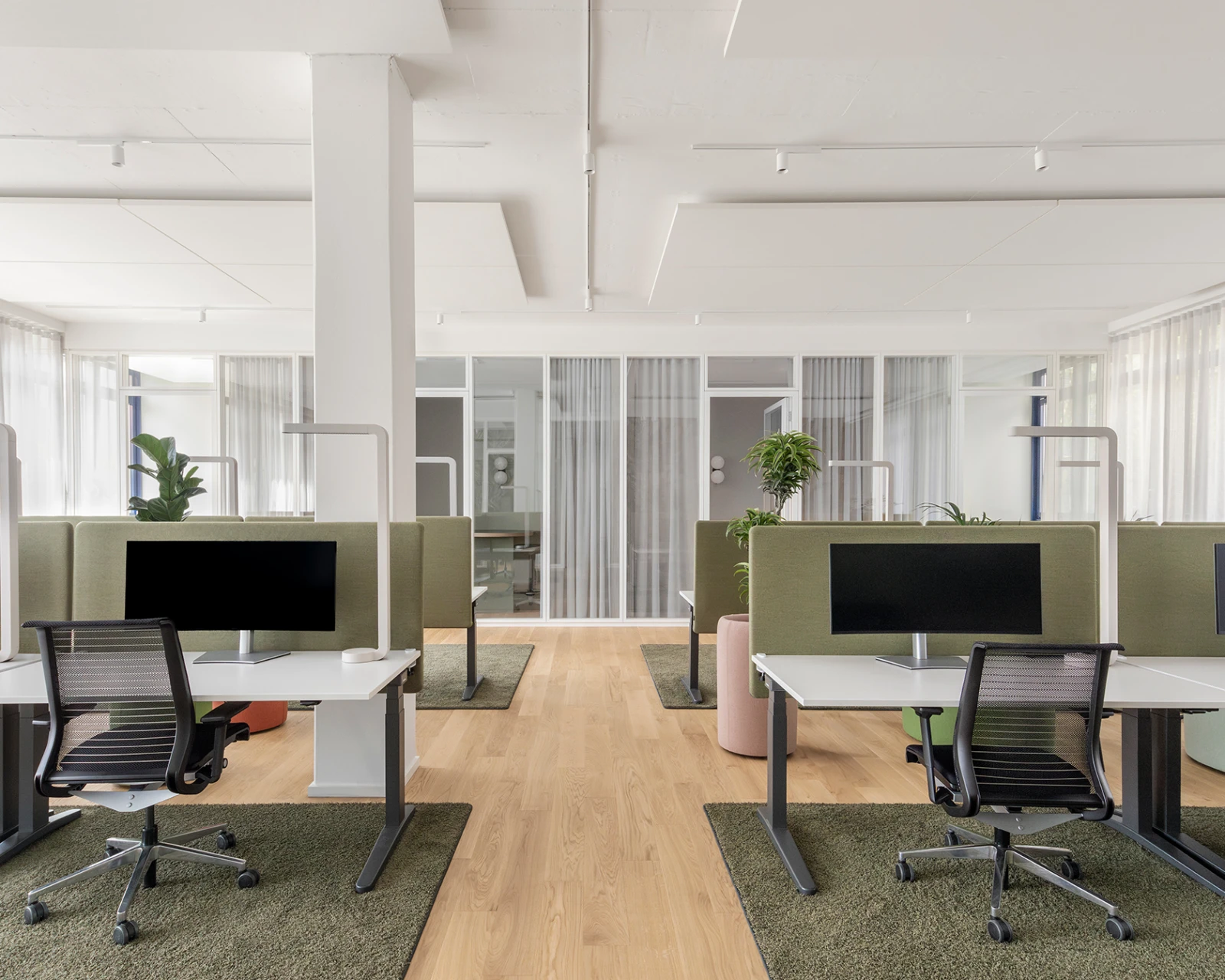 Dabei unterscheiden sich Arbeitsorte ähnlicher Funktionalität in Farbe, Form und Ausstattung - es stehen individuelle Wahlmöglichkeiten zu Verfügung. Ein hoher Grad an Transparenz mit gleichzeitiger Möglichkeit konzentriert arbeiten zu können, unterstützt das Zusammenkommen und Zusammengehörigkeitsgefühl. Warmen Farbtöne sowie Holz- und Glasflächen dominieren in den Büroflächen.