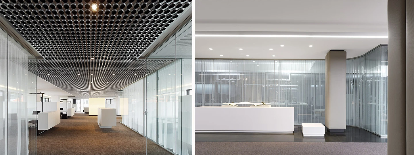 Das Bestandsgebäude verlangte zudem eine hohe Anpassungsfähigkeit des Systems, beispielsweise um präzise Anschlüsse an die teilweise abgeschrägten Decken realisieren zu können. Im Eingangsbereich findet sich System 3400 in der Variante mit einer gebogenen Verglasung. Aufgrund seiner Transparenz ermöglicht System 3400 maximale Einsicht in Fluchtwege und Büros, was dem Wunsch der Architekten und Nutzer nach einer offenen, kommunikativen Innenraumgestaltung entgegenkam. System 3400 stellt in diesem Projekt seine Variabilität voll unter Beweis. Diese zeigt sich auch in den konstruktiven Detaillösungen beispielsweise für die Schrankbefestigung und die Anschlüsse an schräge Decken, die Strähle gemeinsam mit den Architekten erarbeitet hat.