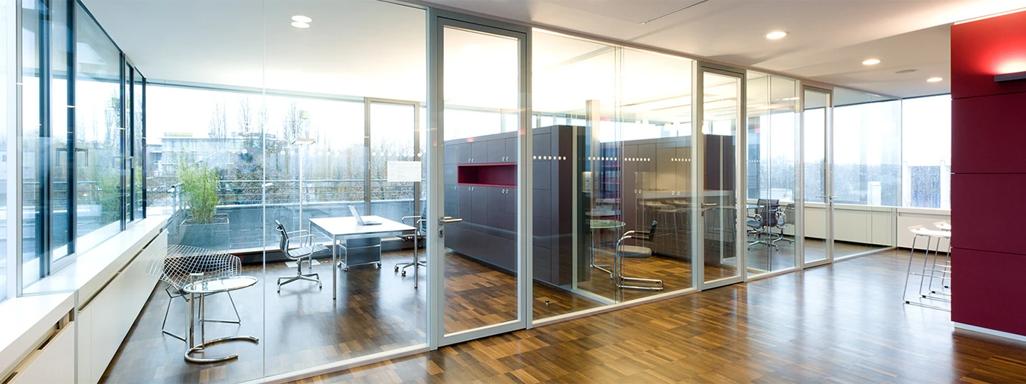 Repräsentativ und weitläufig fasziniert das Skyoffice mit seinem weiten Blick in die Weinberge der Umgebung. Der offene Raum kann mit verschiedenen Elementen für individuelle Nutzungen angepasst werden. Er dient für wechselnde Ausstellungen und Präsentationen vor großem Publikum. Ebenso kann er für Besprechungen oder Konferenzen genutzt werden. Das rahmenlose Trennwandsystem 3500 mit Doppelverglasung sorgt für maximale Transparenz bei gleichzeitig hohen Schallschutzanforderungen. Aufgrund der eleganten Erscheinung eignet sich das System 3500 besonders für Flur- und Besprechungsbereiche.