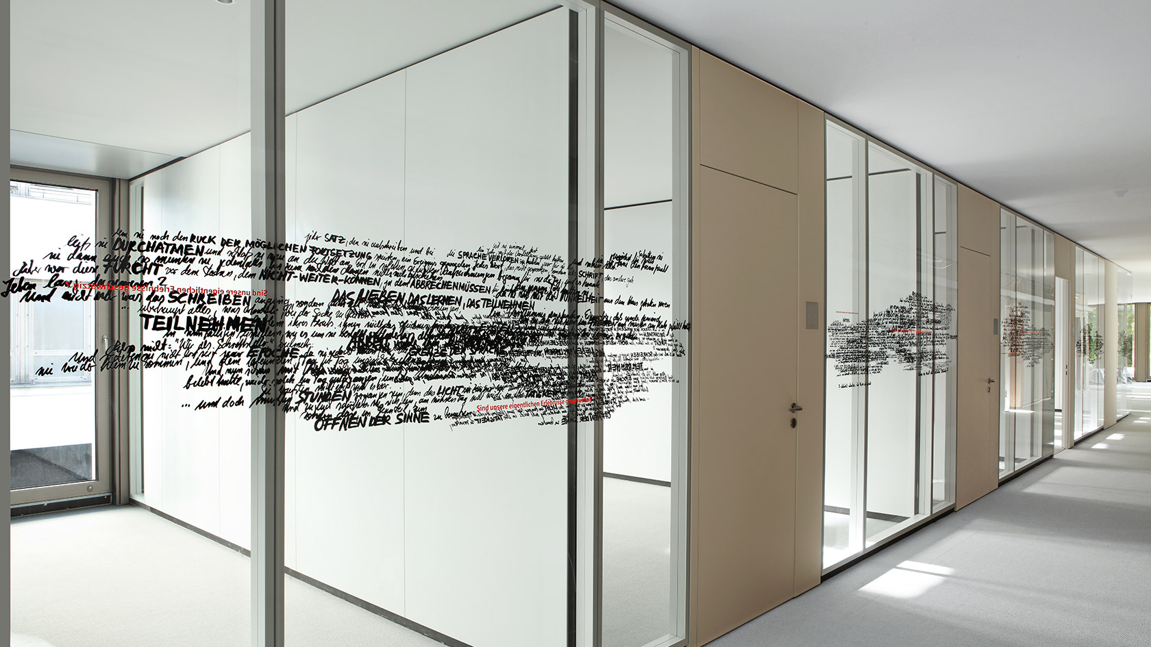 Die Motive wurden mit keramischen Farben als Digitaldruck auf die Glasflächen aufgebracht und dann eingebrannt. Im Vorfeld arbeiteten die Künstlerin, die Architekten und die Projektverantwortlichen von Strähle eng zusammen, um die Komposition der Motive und insbesondere die Lauflänge der Schriften optimal an die unterschiedlichen Formate der Glasflächen anzupassen. Die architektonisch und künstlerisch gestalteten Räume eröffnen den Mitarbeitern immer wieder neue Perspektiven.