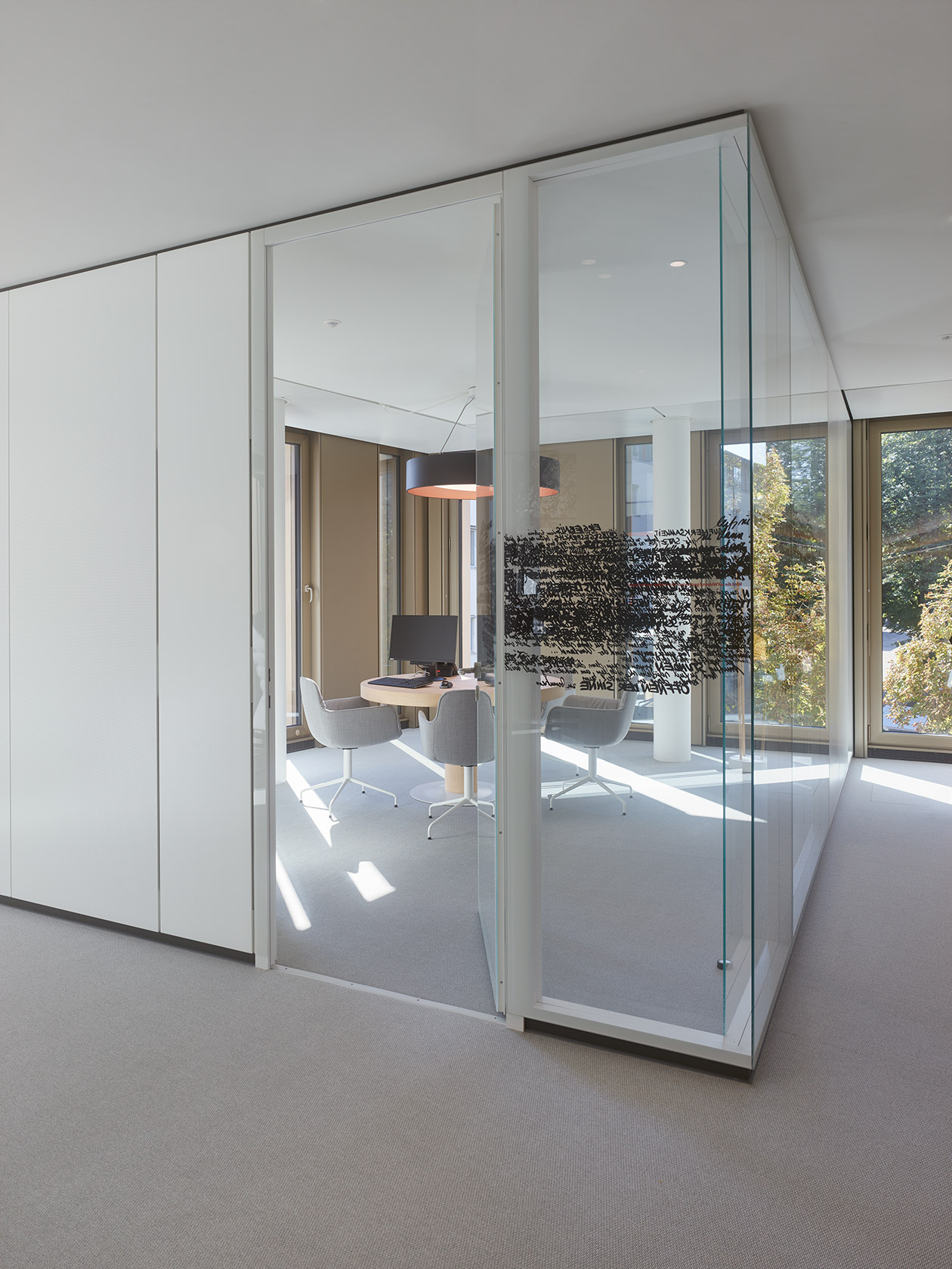 Dem Wunsch nach Transparenz und einer hohen Aufenthaltsqualität wurde durch offene Raumstrukturen entsprochen. Die komplexen Anforderungen an Aufbau und Funktionalität der Glaswände erfüllte Strähle mit seinem zweischalig aufgebauten System 2300, das sich neben seiner eleganten flächenbündigen Verglasung durch besondere Flexibilität auszeichnet. Außer schalldämmender Wirkung leisten die Glaswände durch Integration von mikroperforierten Wandabsorbern einen wichtigen Beitrag zur Schalldämpfung.