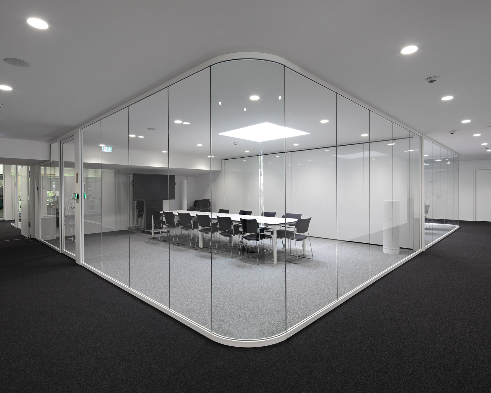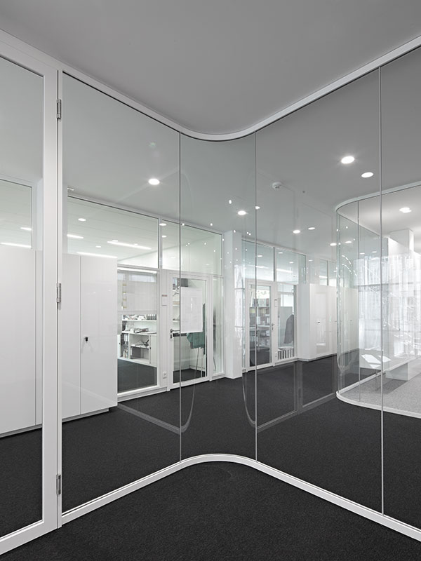 Seit kurzem residiert das Universitätsbauamt Freiburg im ehemaligen Gesundheitsamt in Freiburg-Herdern. Dank gekonnter Revitalisierung erstrahlt das viergeschossige Gebäude aus dem Jahr 1965 heute in moderner Architektur mit raumhohen Fassadenöffnungen und großzügigem, transparentem Interior. Um eine flexible Raumgliederung auch für künftige Anforderungen sicherzustellen, gab das Projektteam in der Ausschreibung versetzbare Trennwandsysteme vor. Abhängig von der Nutzung der Räume und den zu erfüllenden Brand- und Schallschutzauflagen mussten diese unterschiedlich ausgeführt werden, sollten aber in jedem Fall für ein lichtdurchflutetes Ambiente sorgen. Das Spektrum reichte von zweischaligen Oberlichtglaswänden zur flurseitigen Abtrennung der Mehrpersonenbüros und kleineren Besprechungsräume über Ganzglaswände mit integrierbaren Jalousien für den Konferenzbereich bis hin zu Ganzglassystemen mit abgerundeten Ecken für den im Gebäudeinneren liegenden Besprechungsraum sowie den Post- und Druckerraum.