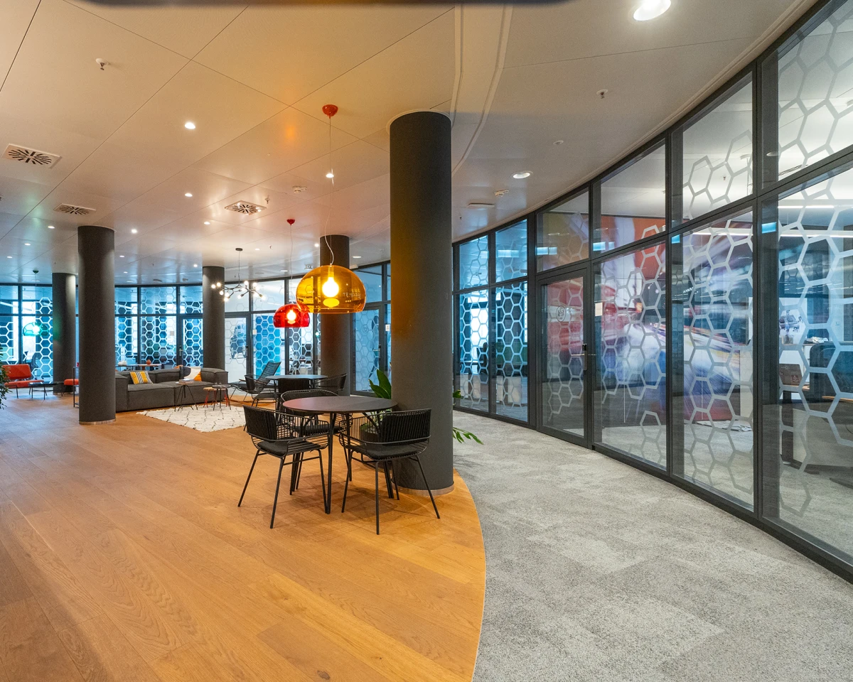 Die eingesetzte Spiegelfolie auf der Glaswand trennt den Spielertunnel und den Veranstaltungsraum optisch voneinander. Dadurch wird die Wand zum wichtigen Gestaltungselement und sorgt dafür, dass die Spieler nicht abgelenkt werden während die Fans von innen nach außen den freien Blick genießen können.