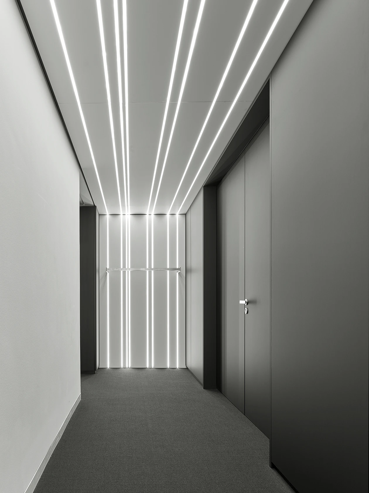 Im Innenraum stehen dunkle, anthrazitfarbene Flächen und Edelstahl für zeitlosen Stil. Das Trennwandsystem 2000 sowie die Structural-Glazing-Variante System 2300 von Strähle mit anthrazitgepulverten Profilen und höchsten Schallschutz wurde für die Büroflächen gewählt. Diesen werden weiße Wände und warme Akzente wie Holzlamellen aus Natureiche spannungsvoll gegenübergestellt. Letztere sind eine Referenz an den nahegelegenen Schwarzwald und die lokale Bautradition.