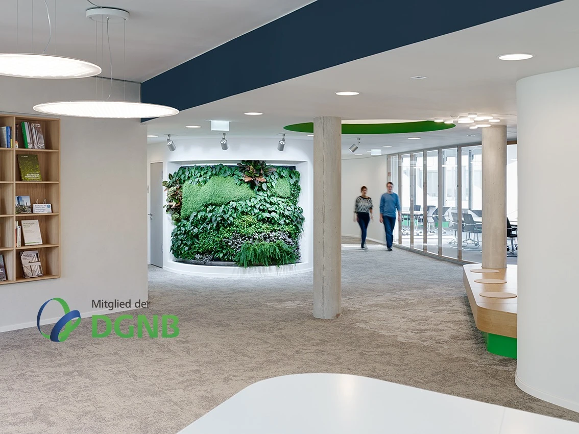 Die Arbeit der Deutschen Gesellschaft für Nachhaltiges Bauen, DGNB, verfolgt das Ziel, Wege und Lösungen aufzuzeigen und zu fördern, die nachhaltiges Bauen ermöglichen. Kern ihrer Arbeit ist die Vergabe von Zertifikaten für nachhaltige Bauwerke nach dem DGNB Zertifizierungssystem. Die DGNB Geschäftsstelle fungiert als Living Showroom für nachhaltiges Bauen. Eine sensible Gestaltung der Innenräume nach Prinzipien wie Nutzerkomfort, Umweltverträglichkeit und Lebenszyklusbetrachtung ergänzt diesen Ansatz mit Glaswänden von Strähle in Holz-Pfosten-Riegel Bauweise optimal.